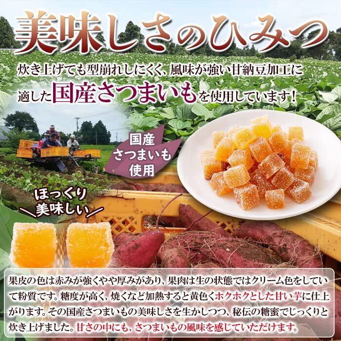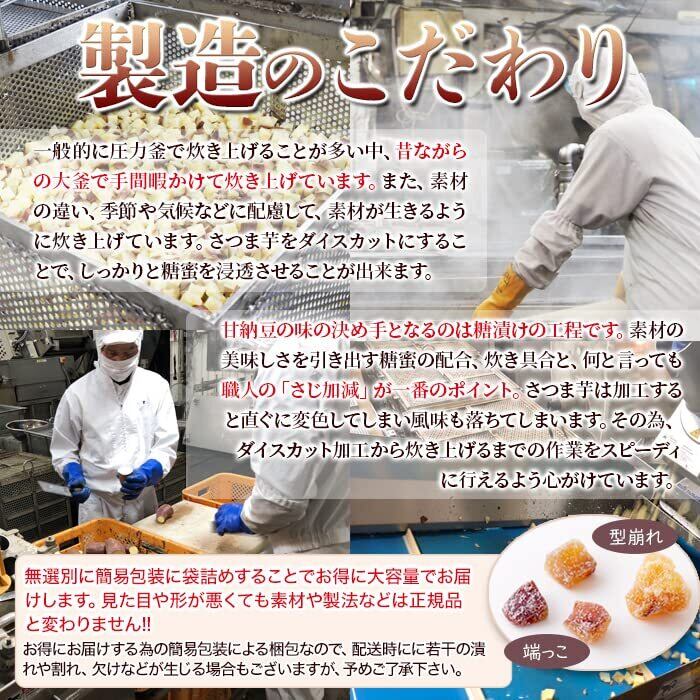 【製造のこだわり】甘納豆の味の決め手となる糖漬けの工程は職人がこだわり、素材が最も生きるように炊き上げています。さつま芋をダイスカットにすることで、しっかりと芯まで糖蜜を浸透させることが出来ます。 無選別に簡易包装に袋詰めすることでお得に大容量でお届けします。見た目や形が悪くても素材や製法などは正規品と変わりません!! お得にお届けする為の簡易包装による梱包なので、配送時に若干の潰れや割れ、欠けなどが生じる場合もございますが、予めご了承下さい。