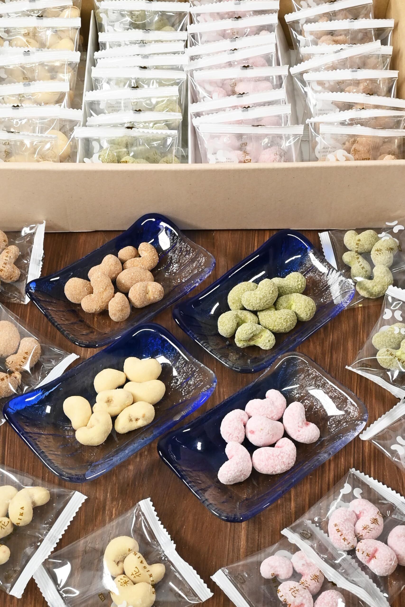 【華やか4種の詰め合わせ】見た目にも華やかな4種類のカシューナッツのお菓子の詰め合わせです。カシューナッツに衣をまとわせ、焙煎して表面をカリッと仕上げました。味、色、香りにこだわった個包装のお菓子です。「さくら、チーズ、抹茶、メイプル」の風味です。小分けのミックスナッツのお菓子・豆菓子をお探しの方にもちょうどいいサイズです。