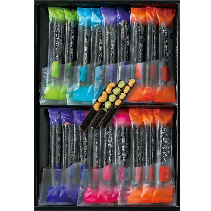 香ばしい国産海苔で包んだ豆菓子「風雅巻き」を5種類詰め合わせたセットです。醤油の旨味を生かした大豆やピーナッツ、香り豊かなわさび大豆、香ばしいカシューナッツなど、多彩な味をお楽しみいただけます。1本ずつ個包装されており、食べやすく衛生的で保存もしやすいため、ご家庭のおやつやおつまみ、来客時のお茶菓子としても便利です。上品な化粧箱入りで、お歳暮やお中元、手土産などのギフトにも適しています。内容量は21本(醤油大豆・醤油ピーナッツ 各3本×各2袋、わさび大豆・醤油カシューナッツ・塩ピーナッツ 各3本×各1袋)、箱サイズは約32.9×23×4.2cmです。保存は直射日光や高温多湿を避け、常温で行ってください。