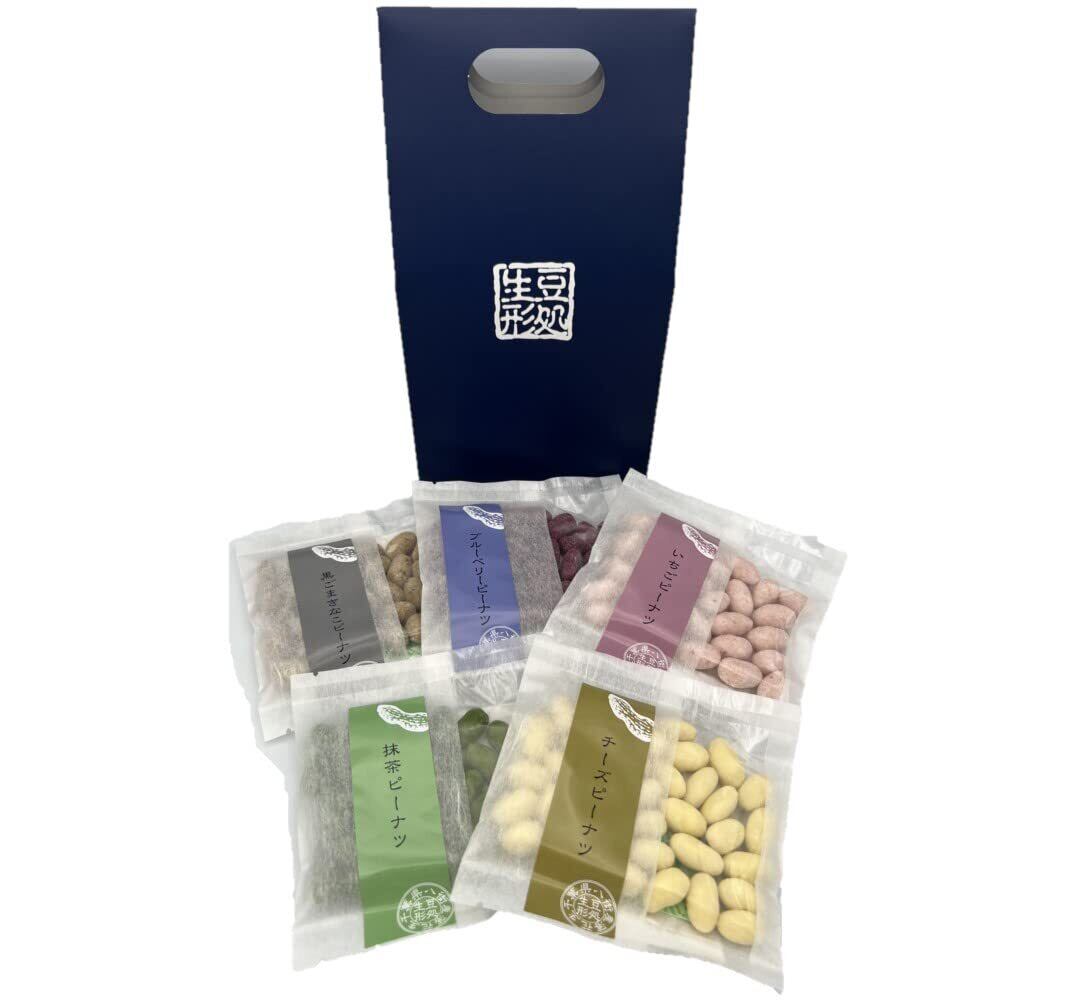 豆処生形 千葉県八街産落花生 豆菓子 ギフトパックお茶請けセット(チーズ35ℊ、抹茶35ℊ、苺35ℊ、黒ごまきな粉35ℊ、ブルーベリー35ℊ、 各1)おしゃれな手提げバッグ 着色料、防腐剤不使用 自社工場製造 元祖ソフトコーティング