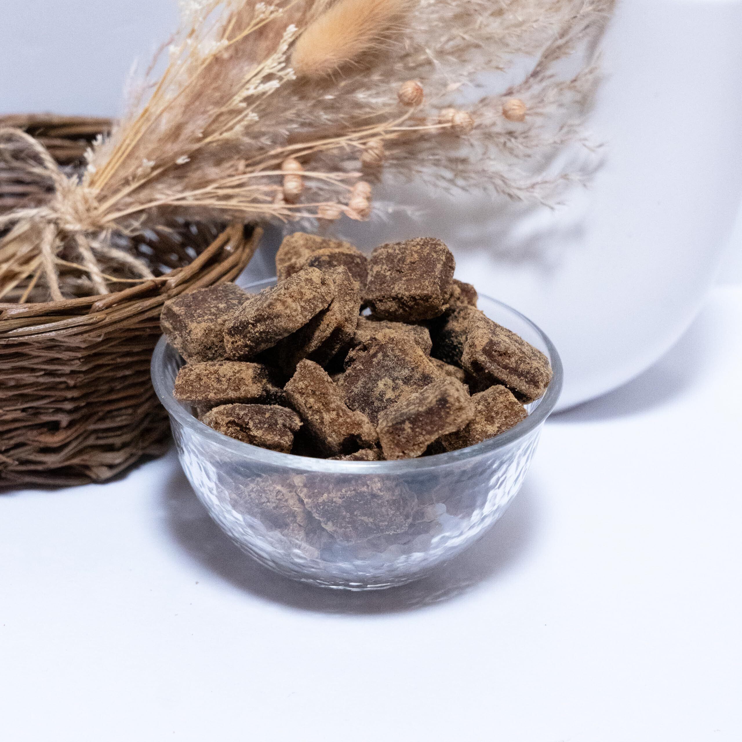 多良間島の黒糖は、しっかりとした甘みが特徴で、粒はこげ茶色の長方形。
