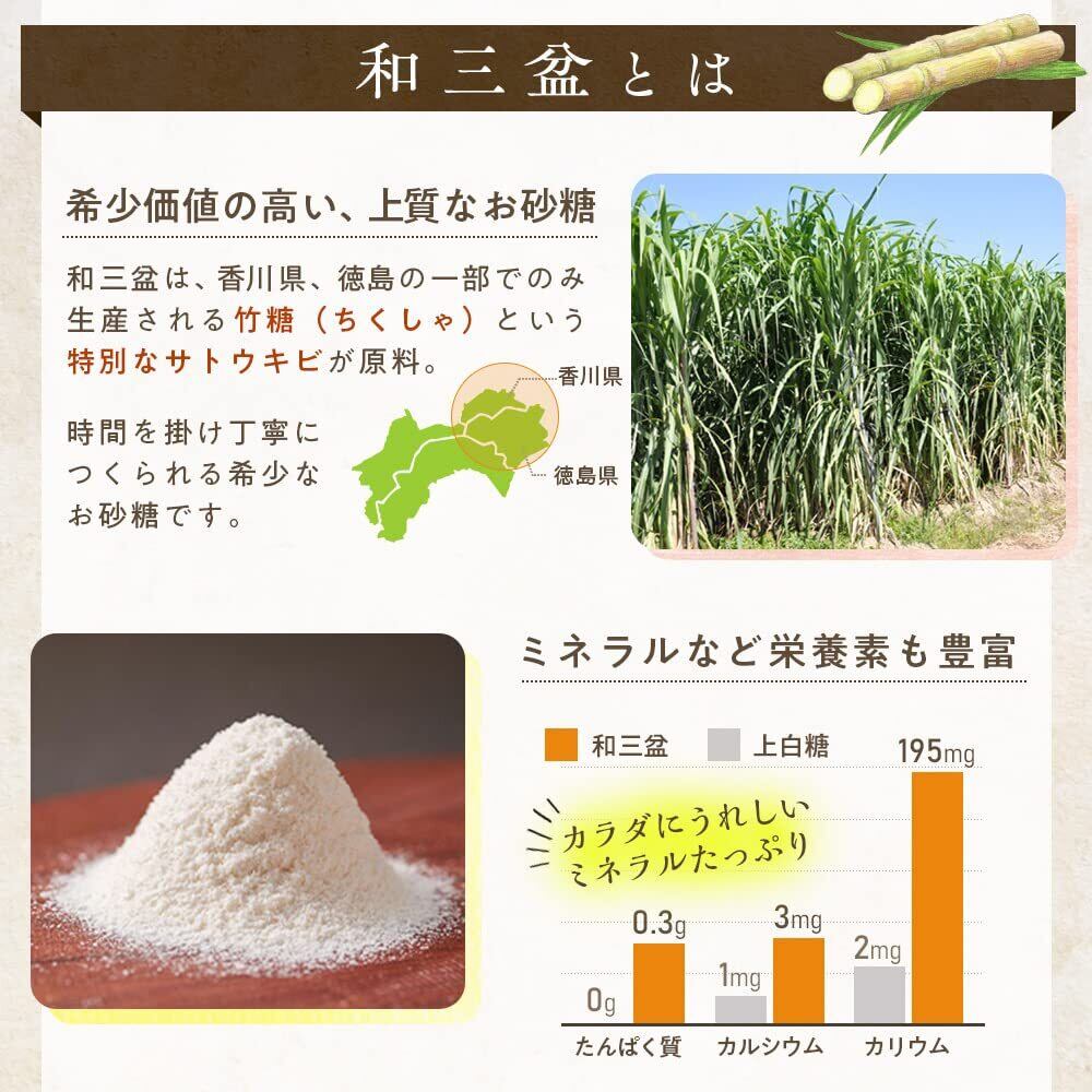 【和三盆は希少価値の高いお砂糖】 和三盆は、香川県、徳島の一部でのみ生産される竹糖という特別なサトウキビからつくられます。手間も時間もかかる製法で今も作られている希少なお砂糖です。雪のように溶ける、上品なくちどけのお砂糖です。
