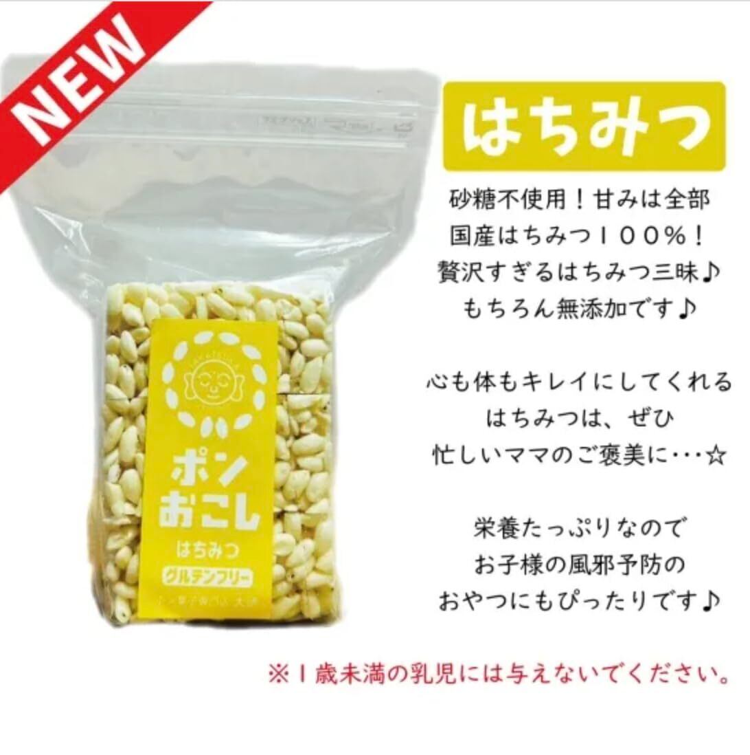 自然豊かな大分県玖珠町で育った新米一等米「ひとめぼれ」を使ったポンおこしシリーズに、はちみつ味が新たに仲間入りしました。