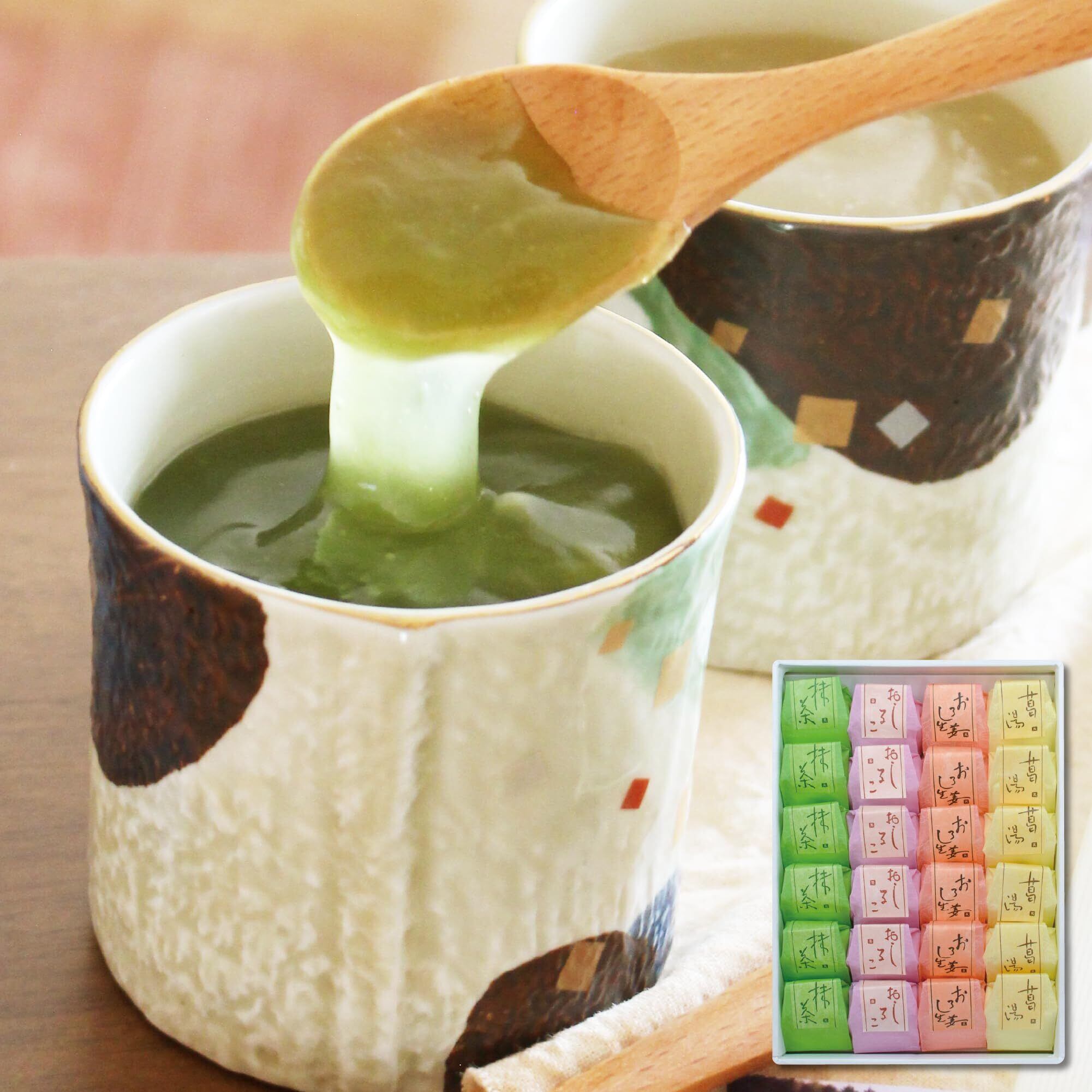 【内容量】葛の里葛湯 葛(プレーン)6個、抹茶6個、おろし生姜6個、おしるこ6個