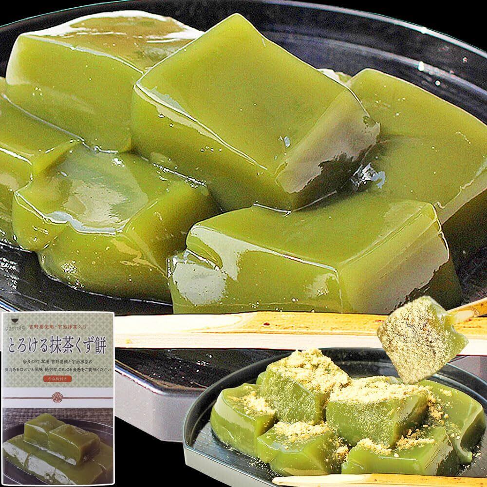 ・奈良の町 本場 吉野葛使用 宇治抹茶くず餅!弾力ある「吉野葛」使用の葛餅と「宇治抹茶」の風味のバランスが絶妙です!シツコクなくあっさりした後味が特徴です!お好みできな粉をかけてお召し上がりください!