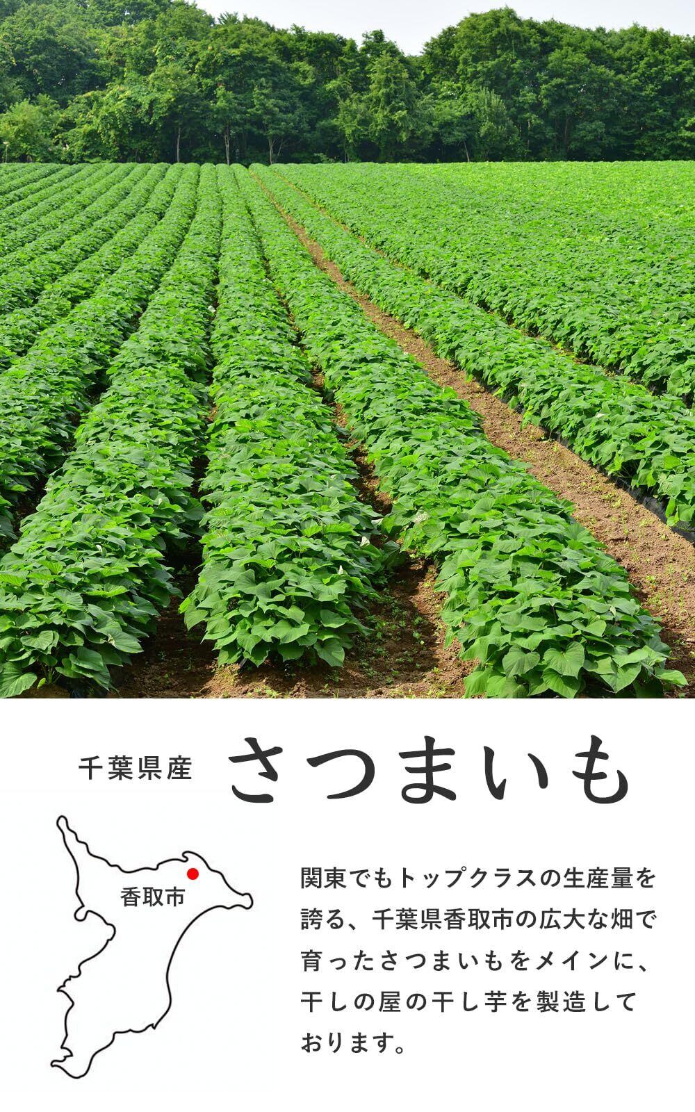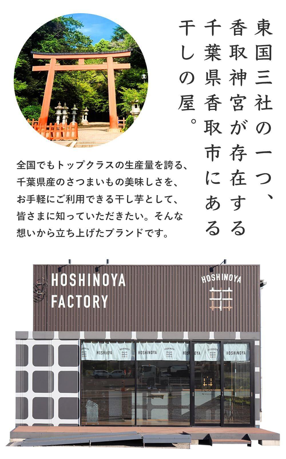 【干しの屋とは】東国三社の一つ、香取神宮が存在する千葉県香取市にある干しの屋。全国でもトップクラスの生産量を誇る、千葉県産のさつまいもの美味しさを、お手軽にご利用できる干し芋として、皆さまに知っていただきたい。そんな想いから立ち上げたブランドです。