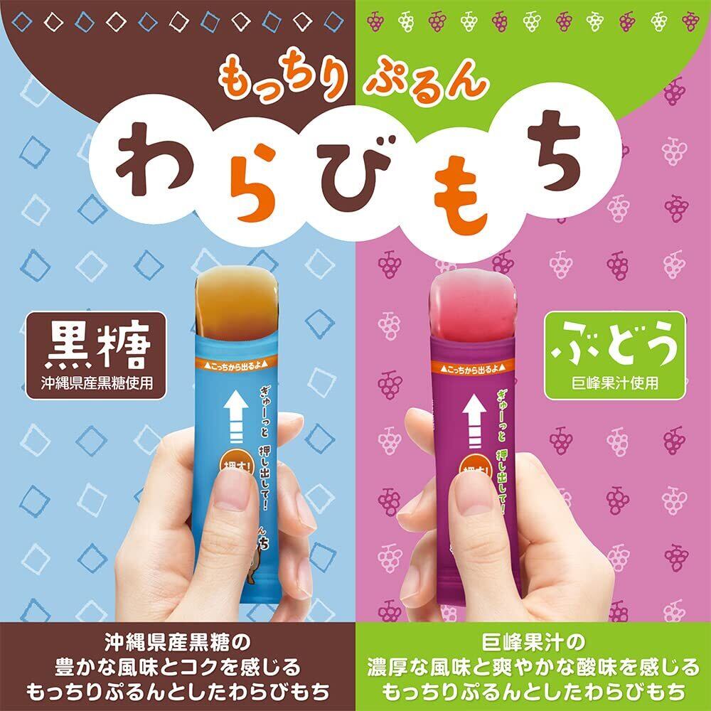 素材の風味をしっかり感じられるスティックタイプのわらびもちです。黒糖とぶどうの2種をアソートしたEC限定商品です。【黒糖】沖縄県産黒糖を使用しています。【ぶどう】巨峰果汁を使用し、ぶどうの濃厚な風味と爽やかな酸味をお楽しみいただけます。どちらも「もっちりぷるん」とした食感を楽しめます。片手で商品中央部を押すだけで、中身のわらびもちが出てくるので、はさみや包丁を準備する事なくお召し上がりいただけます。食べたい量を少しずつ食べられる、約14g~15gの食べきりサイズです。冷やしても、おいしくお召し上がりいただけます。アソートBOXタイプなので、オフィスやリビングに置いてみんなでシェアしたり、買い置き菓子としても便利です。