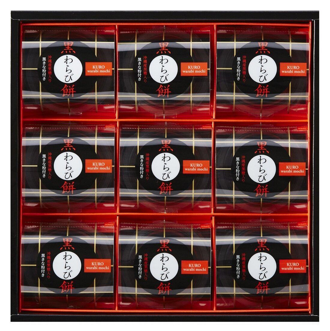 原材料:<黒わらび餅>砂糖、黒糖蜜(黒糖:沖縄県産)、本わらび粉、ゲル化剤(加工デンプン、増粘多糖類)、カラメル色素、香料<黒きな粉>大豆、砂糖、黒胡麻、黒米、黒豆、黒松の実、黒かりん
