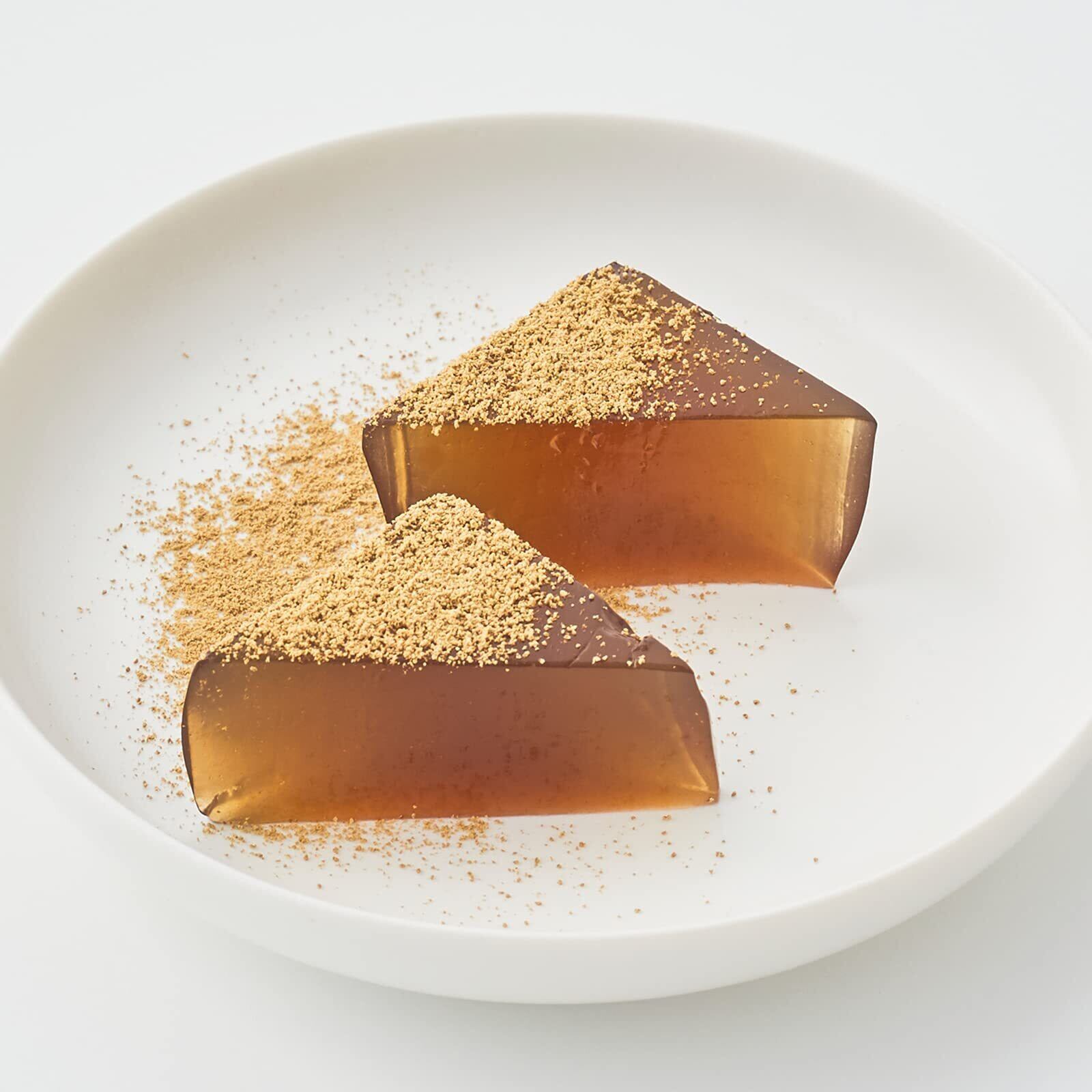 黒糖わらび餅:沖縄の中でも特に甘味のバランスが程よいと評判の波照間産の黒糖を使用し、深いコクのある甘さに仕上げました。わらび餅の食感を引き立てる黒糖の絶妙な味わいをお楽しみいただけるお品です。