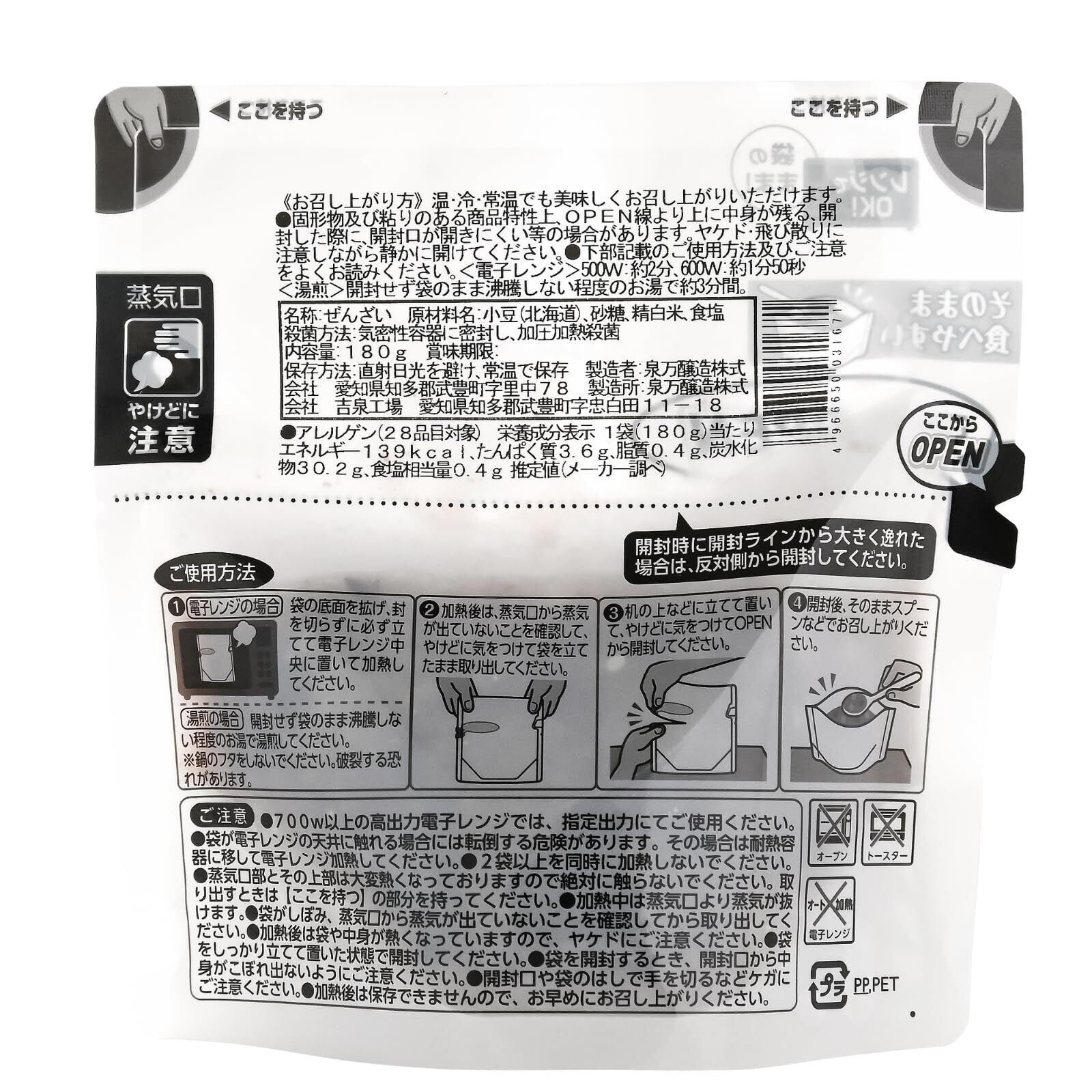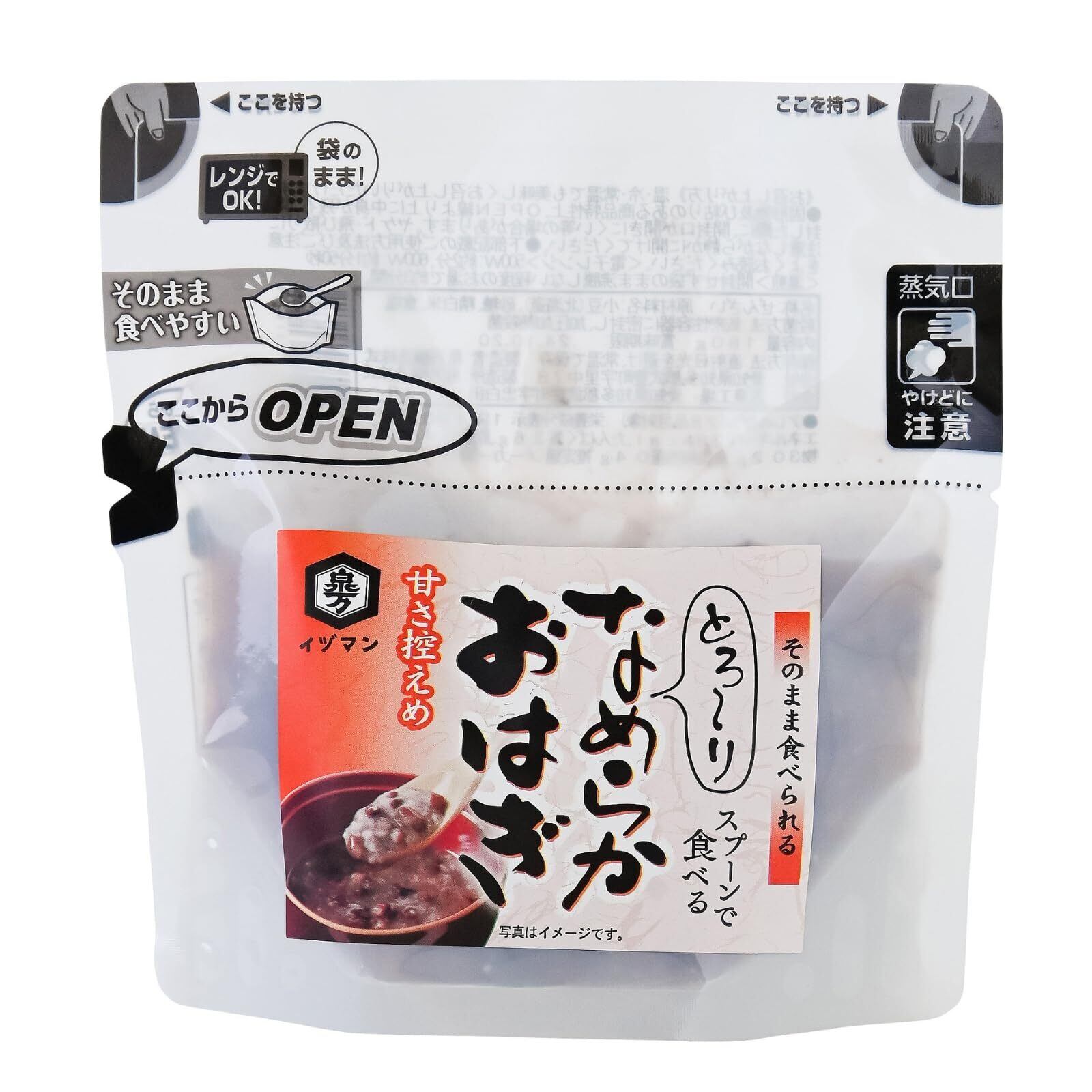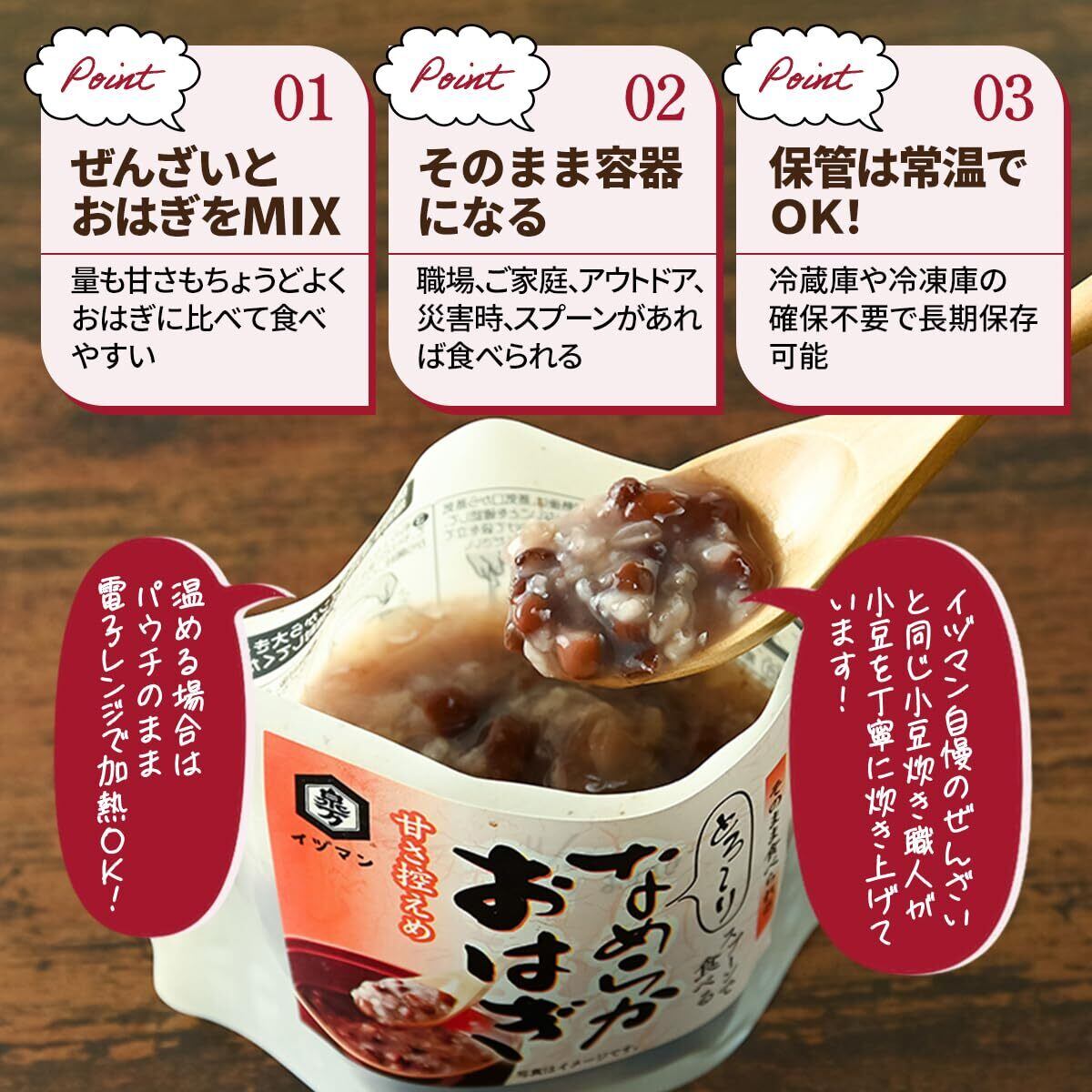 日本の伝統的な和菓子「ぜんざい」と「おはぎ」を融合させた商品です。 小豆を職人が炊き上げる当社自慢のぜんざいに、お米の程よい食感を合わせ、スプーンで食べられる「おはぎ」のように仕上げました。 お米の甘さを感じられるよう、当社ぜんざいに比べ、てん菜糖の量を抑えています。 原材料は、北海道産小豆、国産てん菜糖、国産米、国産食塩の良質なものだけを厳選しており、安心してお召し上がりいただけます。 パウチは電子レンジ対応で、開封後はワイドにオープンする自立型を使用しています。 手軽に温めることができ、そのまま器としてもご使用できます。 温めても、冷やしても、そのままでも美味しく、 職場やご家庭、アウトドア、災害時などさまざまなシーンで、なめらかでとろりとした食感をすぐに手軽にお楽しみいただけます。