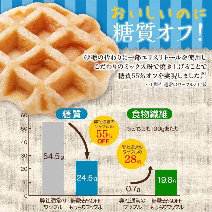 ■商品名:低糖質ワッフル ■名称:焼き菓子 ■原材料名:ミックス粉(小麦たんぱく、でん粉、食物繊維、植物油脂)(国内製造)、マーガリン、砂糖、液卵、牛乳、エリスリトール、イースト、バター、食塩、乳等を主要原料とする食品/加工でん粉、乳化剤、増粘多糖類、香料、甘味料(アセスルファムカリウム)、カロテン色素、(一部に小麦・卵・乳成分・大豆を含む) ■内容量:15個 ■賞味期限:製造日より常温90日 ■保存方法:直射日光を避け冷暗所で保存してください。