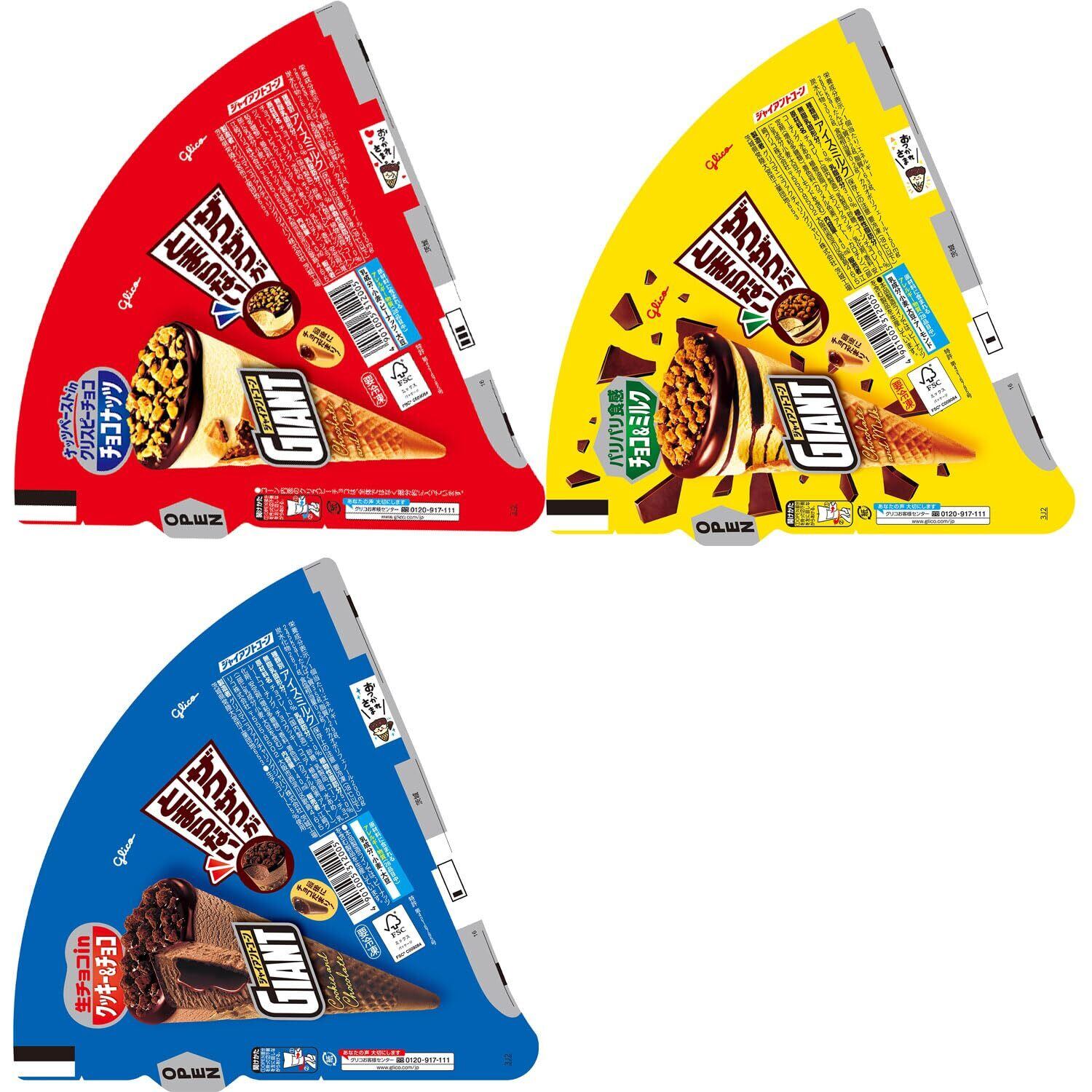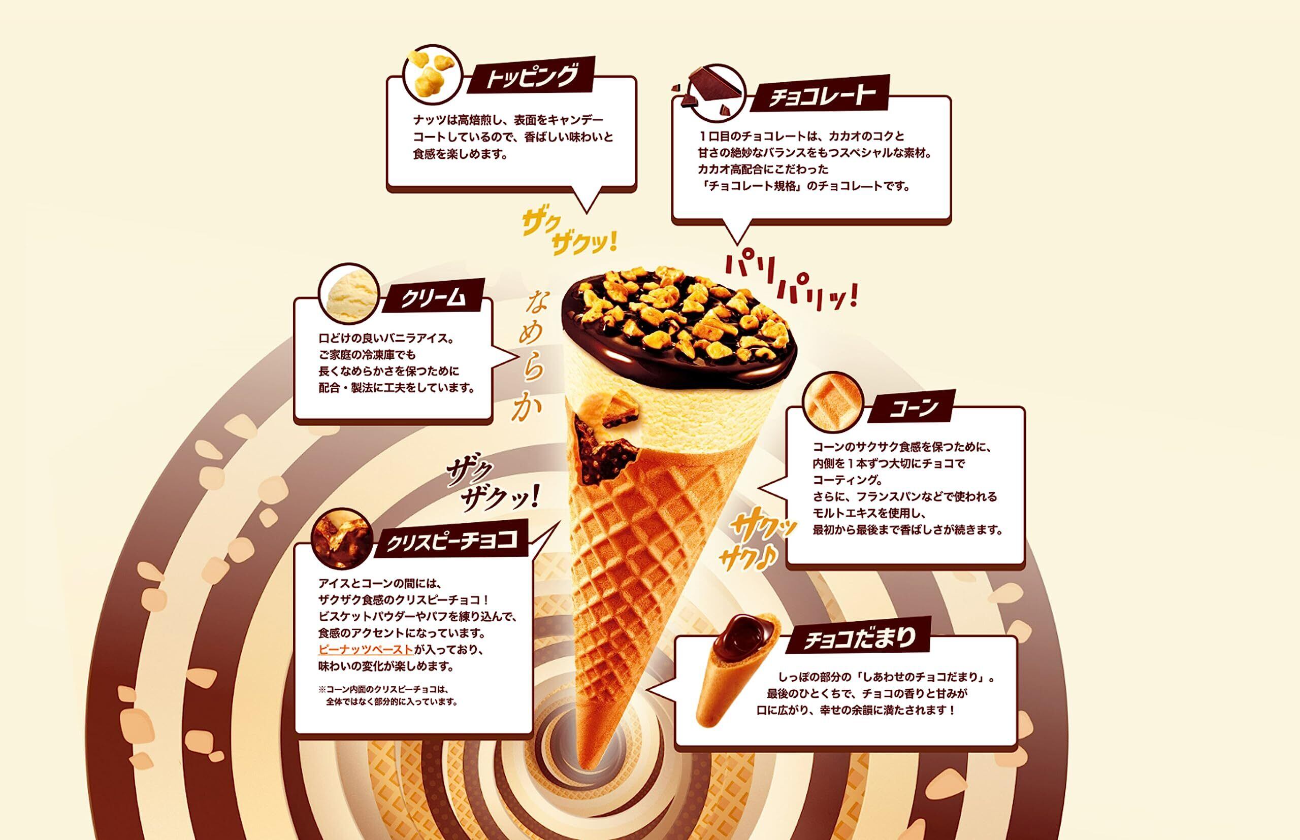 【チョコナッツ】高焙煎ナッツとチョコレートのトッピング、クリスピーチョコのザクザク食感を楽しめる、定番の組合せです。【クッキー&チョコ】チョコクッキーとチョコレートのトッピング、チョコレートアイス、なめらかな生チョコと、チョコ尽くしの組合せです。【チョコ&ミルク】アーモンドクランチ、パリパリチョコ入りミルクアイス、コーンの組合せで、つぎつぎ食べ進められるおいしさです。