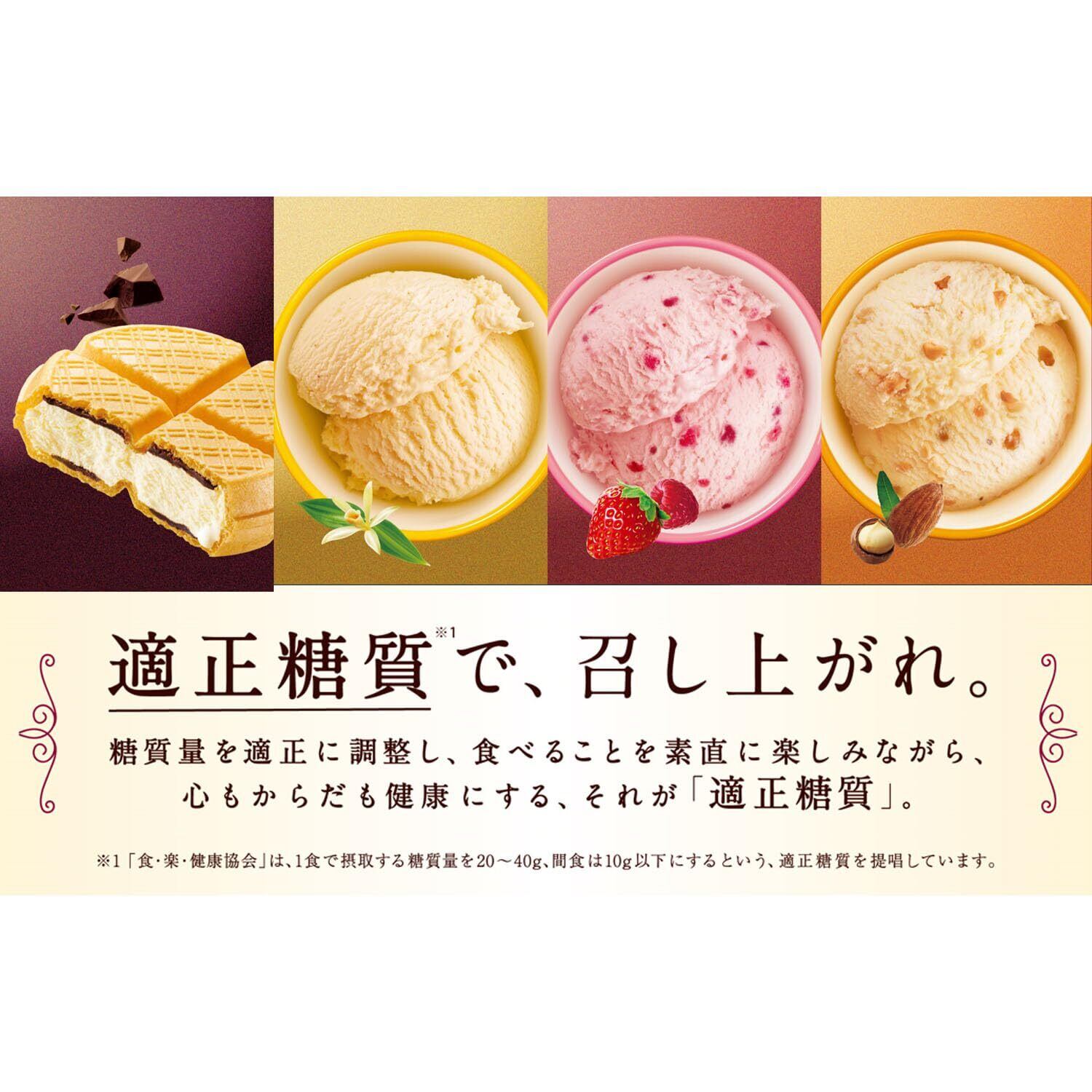 【チョコモナカ】乳製品(国内製造)、準チョコレート、モナカ、食物繊維(ポリデキストロース)、はちみつ、還元水あめ/乳化剤、香料、安定剤(増粘多糖類)、着色料(アナトー、カロチン)、甘味料(スクラロース)、(一部に乳成分・小麦・大豆を含む)【バニラ】乳製品(国内製造、オーストラリア製造)、食物繊維(ポリデキストロース)、はちみつ、還元水あめ、乳等を主要原料とする食品、卵黄パウダー、食塩、バニラビーンズシード/香料、乳化剤、安定剤(増粘多糖類)、調味料(アミノ酸等)、甘味料(スクラロース)、カロチン色素、(一部に卵・乳成分を含む)【マカダミア&アーモンド】乳製品(国内製造、オーストラリア製造)、水溶性食物繊維、マカダミアナッツ、はちみつ、アーモンド、乳等を主要原料とする食品、食塩/乳化剤、香料、安定剤(増粘多糖類)、甘味料(スクラロース)、カロチン色素、(一部に乳成分・アーモンドを含む)【ストロベリー&ラズベリー】乳製品(オーストラリア製造、国内製造)、いちご果汁・果肉、水溶性食物繊維、ラズベリー果肉/香料、安定剤(増粘多糖類)、乳化剤、酸味料、甘味料(スクラロース)、乳酸カルシウム、野菜色素、(一部に乳成分を含む)