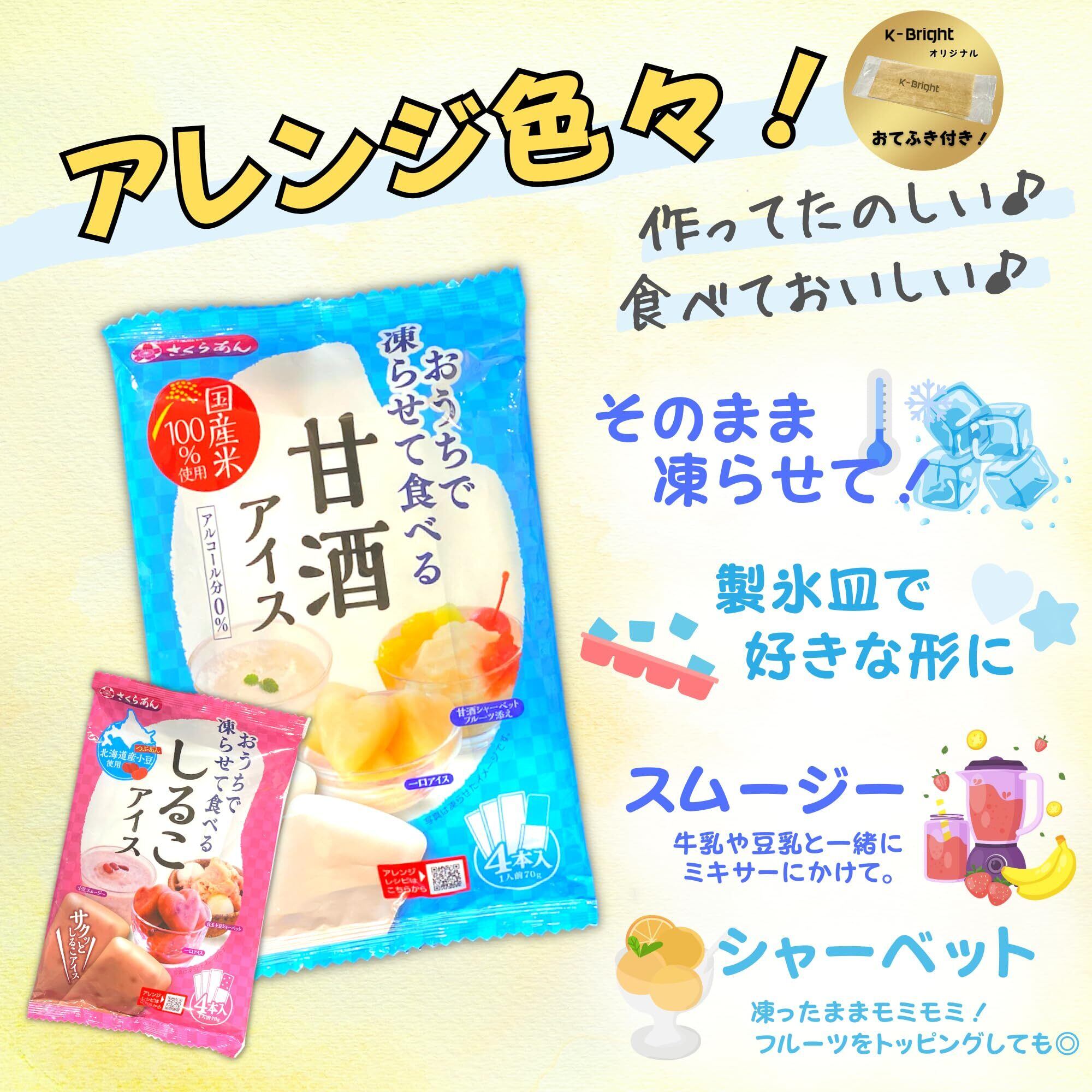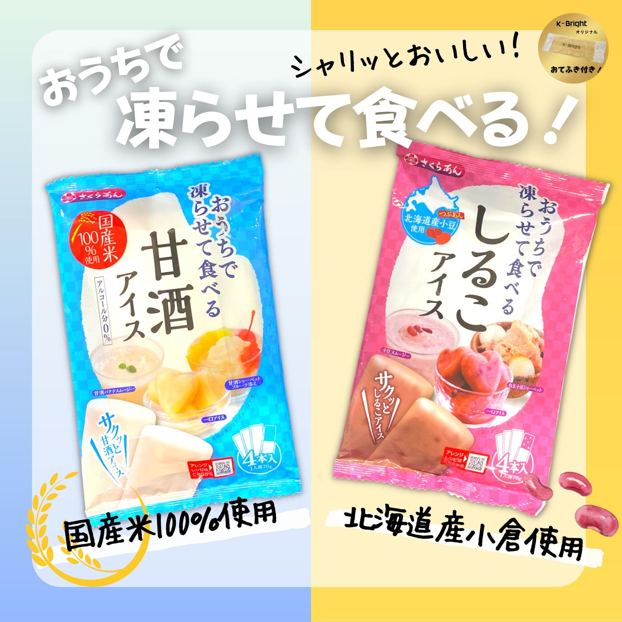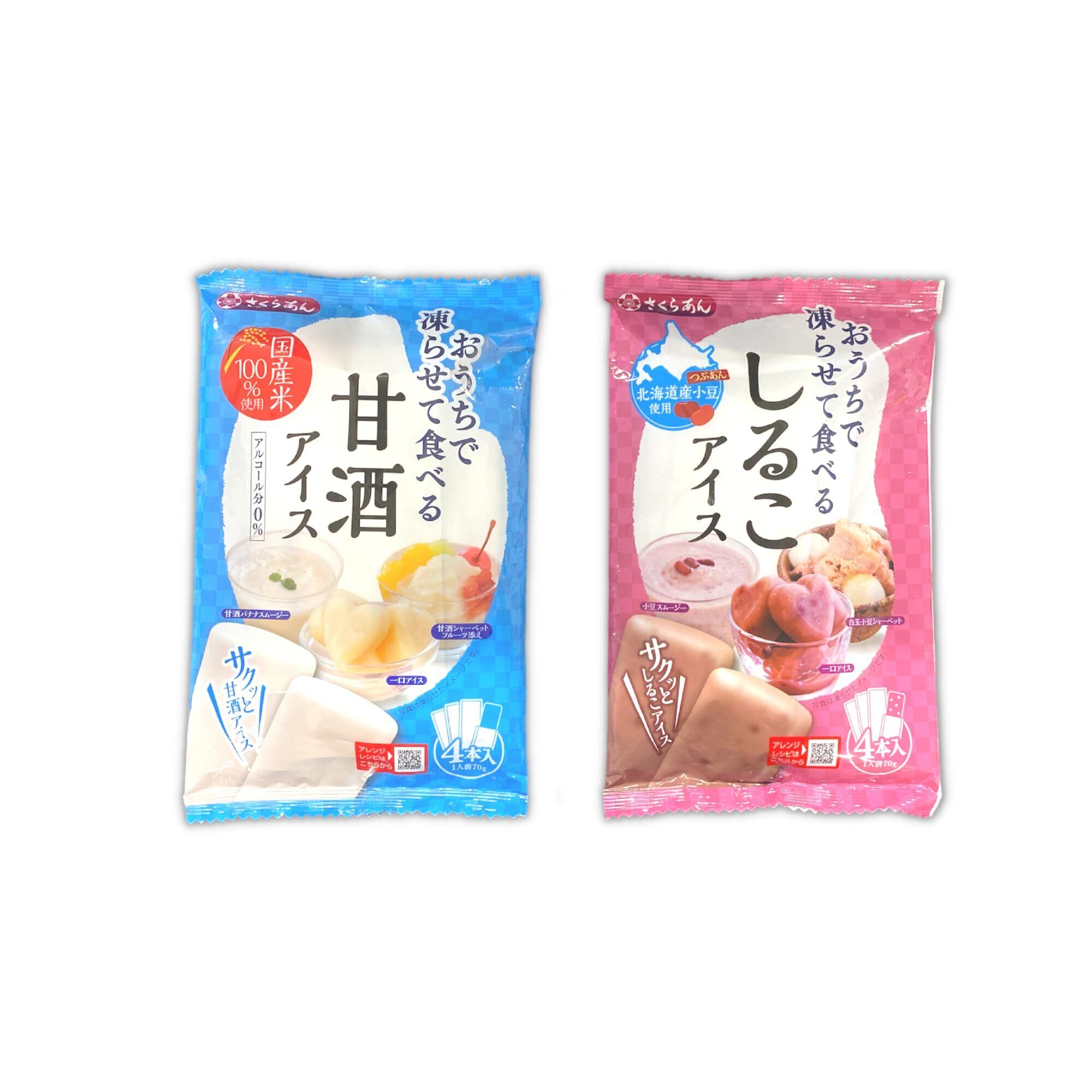 サクッとおいしい! おうちで凍らせて食べるアイス シリーズ 4袋セット です。( おしるこ2袋 , 甘酒2袋 )。便利な、常温で 家に帰ってから 凍らせて食べる 商品です。