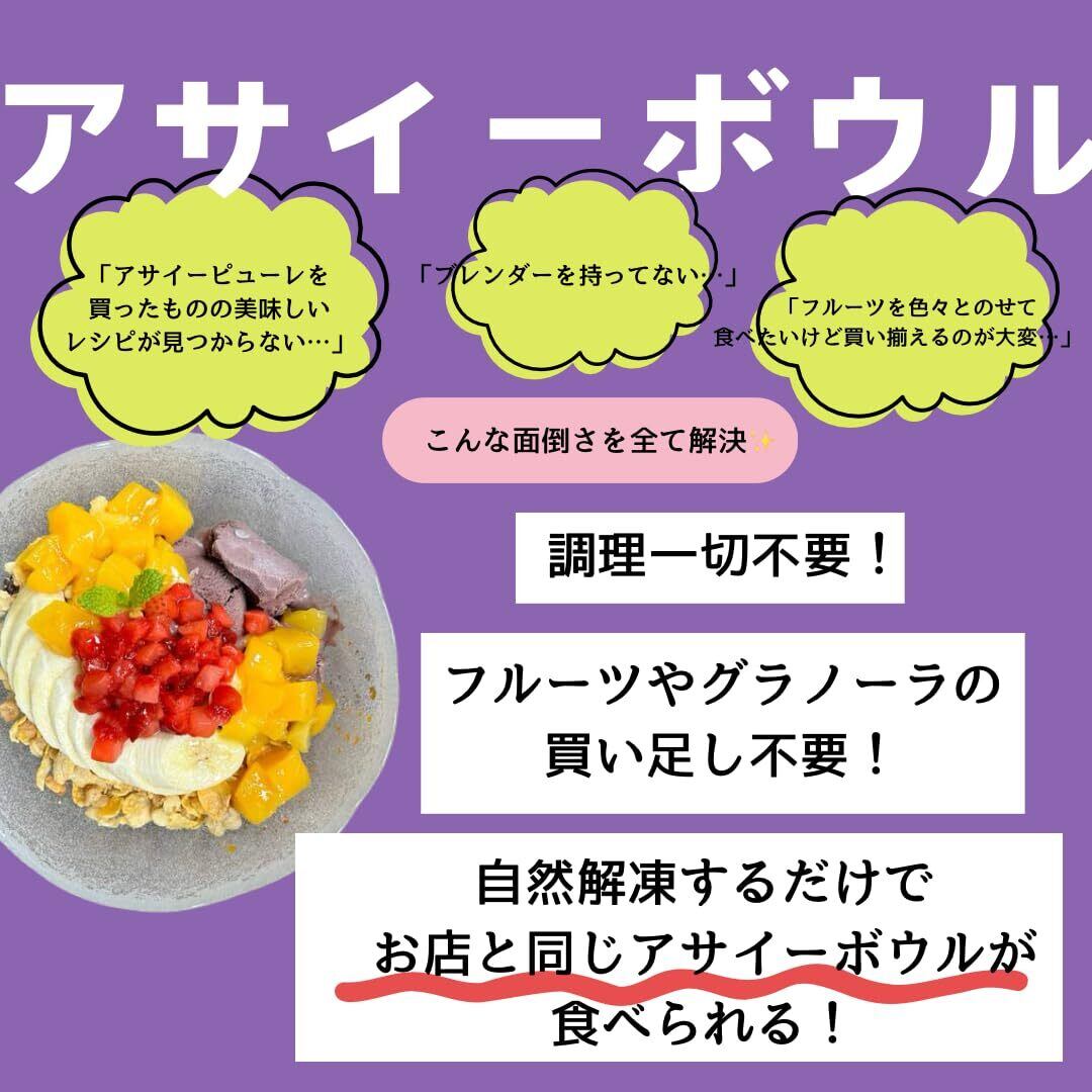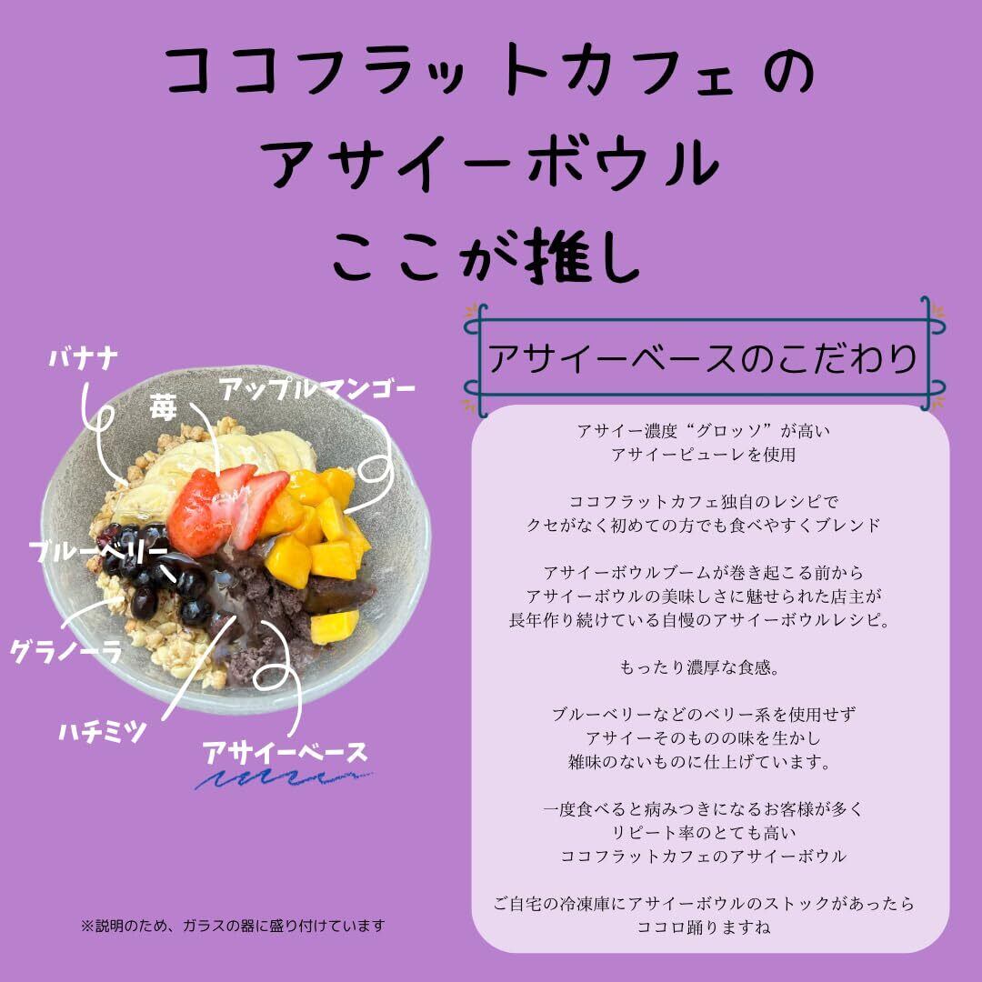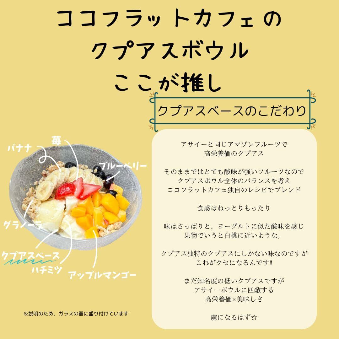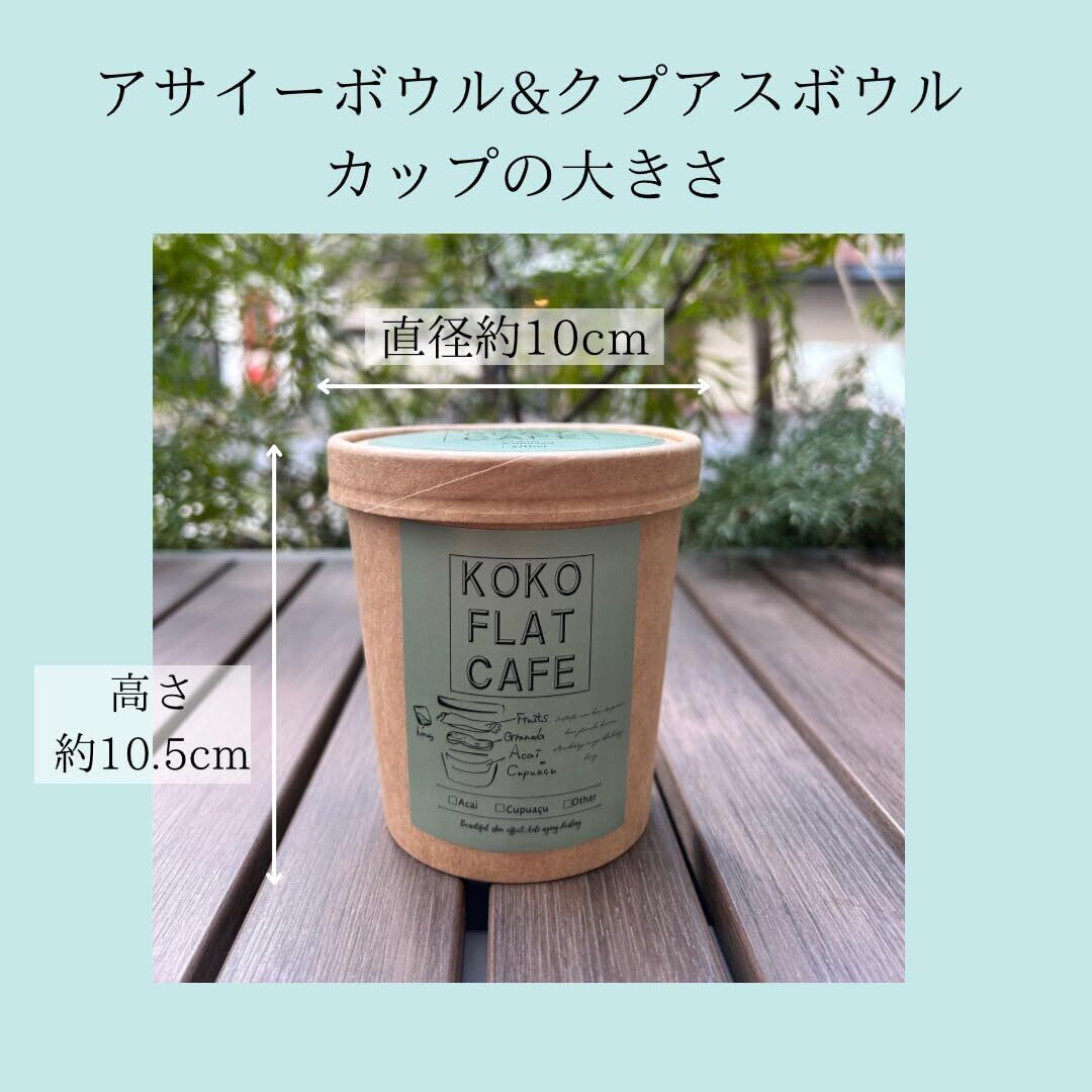 『アサイー』とは 原産のフルーツ ヤシ科で、見た目はブルーベリーに似てるがベリー系ではない 果実の95%は種で、果肉はわずか5%!! 《《《アサイーのここがすごい》》》 アサイーはポリフェノールがブルーベリーの約19倍 アサイーは鉄分がレバーの約3倍 アサイーは食物繊維がごぼうの約3倍 アサイーはカルシウムが牛乳の約3倍 《《アサイーベースのこだわり》》 アサイー濃度"グロッゾ”が高い厳選したアサイーピューレを使用 ココフラットカフェ独自のレシピでクセがなく初めての方でも食べやすくブレンド アサイーボウルブームが巻き起こる前からアサイーボウルの美味しさに魅せられた店主が長年作り続けている自慢のアサイーボウルレシピ。 もったり濃厚な食感。 ブルーベリーなどのベリー系を使用せずアサイーそのものの味を生かし、雑味のないものに仕上げています。 一度食べると病みつきになり、お客様が多くリピート率のとても高いココフラットカフェのアサイーボウル 『クプアス』とは アサイーと同じ原産のフルーツ (味は全然違うが)カカオ科 栄養価が高く「神の果実」と言われるほど!! 《《《クプアスベースのこだわり》》》 アサイーと同じフルーツで高栄養価のクフアス。 そのままではとても酸味が強いフルーツなので、クプアスボウル全体のバランスを考え ココフラットカフェ独自のレシピでブレンド。 食感はねっとりもったり。 味はさっぱりと、ヨーグルトに似た酸味を感じ果物でいうと白桃に近いようなクプアス独特のクプアスにしかない味なのですがこれがクセになるんです!! まだ知名度の低いクプアスですがアサイーボウルに匹敵する高栄養価✕美味しさ 虜になるはず 《《《クプアスのここがすごい》》》 クプアスに含まれる栄養素はビタミンA、ビタミンB1、ビタミンB2、ビタミンC、必須アミノ酸、ポリフェノール、鉄分、葉酸と盛りだくさん。 《《《クプアスボウルは万能フード》》》 ストックしておけば主食にもおやつにもなるので常備食としておすすめ 1日がんばるあなたの朝ごはん ランチ前日食べ過ぎた時のリセット ご褻美!デザート 体調不良で食欲がないとき 疲れてご飯を作りたくない日の夕食 最高の贅沢!お風呂あがり 罪悪感のない夜食 《《《色んなシチュエーションで楽しめるクプアスボウル》》》 ピクニック 冷凍のまま保冷バッグで持ち出せば、数時間後のピクニックに食べ頃!スプーンを忘れずに持っていってください! 女子会&ホームパーティー 美味しくて身体に良いので女子会で喜ばれること間違いなし! 飲み過ぎてしまうパーティーでも罪悪感なく食べれてしまうアサイーボウル お中元・差し入れ・プレゼント・御礼 クール便でのお送りになりますので、到着後の冷凍保管ができる方に限られますが、贈り物としても喜ばれるはずです! 【おすすめのアレンジ】 トッピングをお客さまでアレンジしていただくのもおすすめです! お気に入りのMyアサイーボウルを見つけてみてください! *フルーツを追加 パイン、キウイ、ミックスベリーetc *ハチミツを変更 練乳、チョコソースetc *トッピングをバージョンアップ バニラアイス、ヨーグルト、アーモンド、 ココナッツ、グリークヨーグルトetc