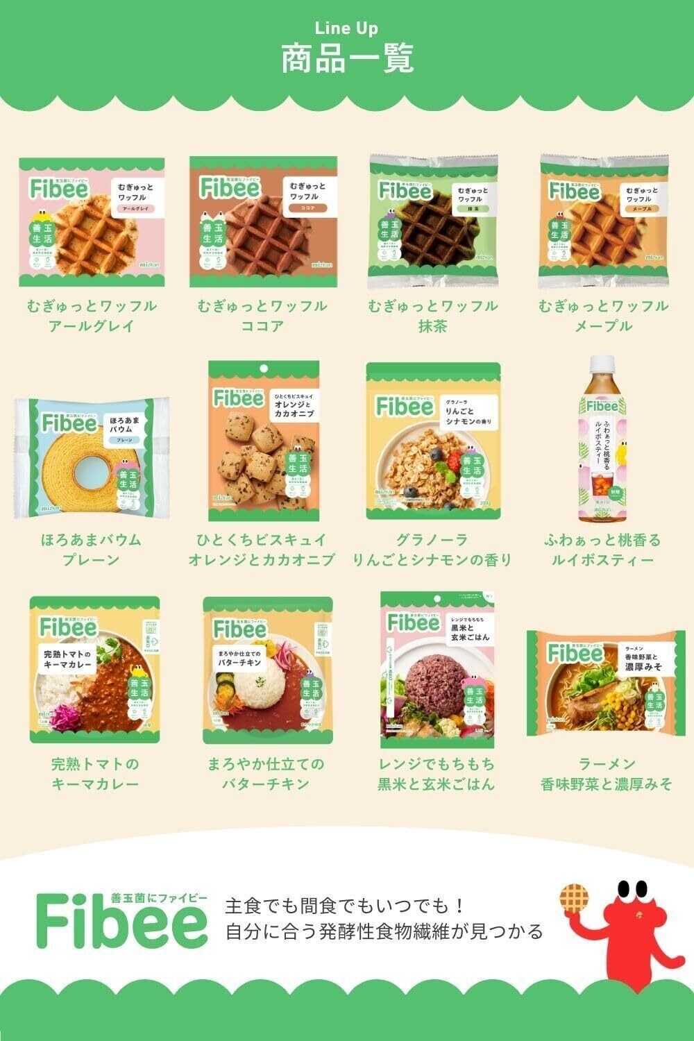 おからや全粒粉を使ってしっとり焼き上げた、むぎゅっと食感のワッフルです。やさしいココア味で、甘さひかえめに仕上げました。おからベースの生地なので腹持ちがよく、小腹満たしにぴったりです。Fibeeは、善玉菌にうれしい発酵性食物繊維がキーポイントの商品です。発酵性食物繊維とは、腸に届いて発酵する食物繊維です。食べると体の中から健康をサポートします。