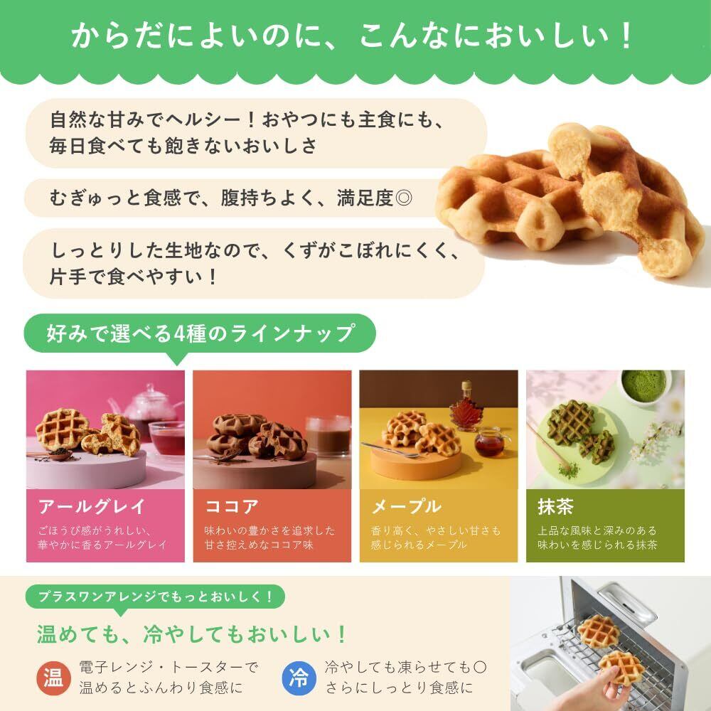 【 ヘルシー で 腹持ち ◎! 】 おから や 全粒粉 を使ってしっとり焼き上げた、やさしい ココア 味のワッフル。 おから や 発酵性食物繊維 が入っていて ヘルシー です。 食べ応え があるので 腹持ち良く 満足感 ◎! 小腹満たし にぴったり。