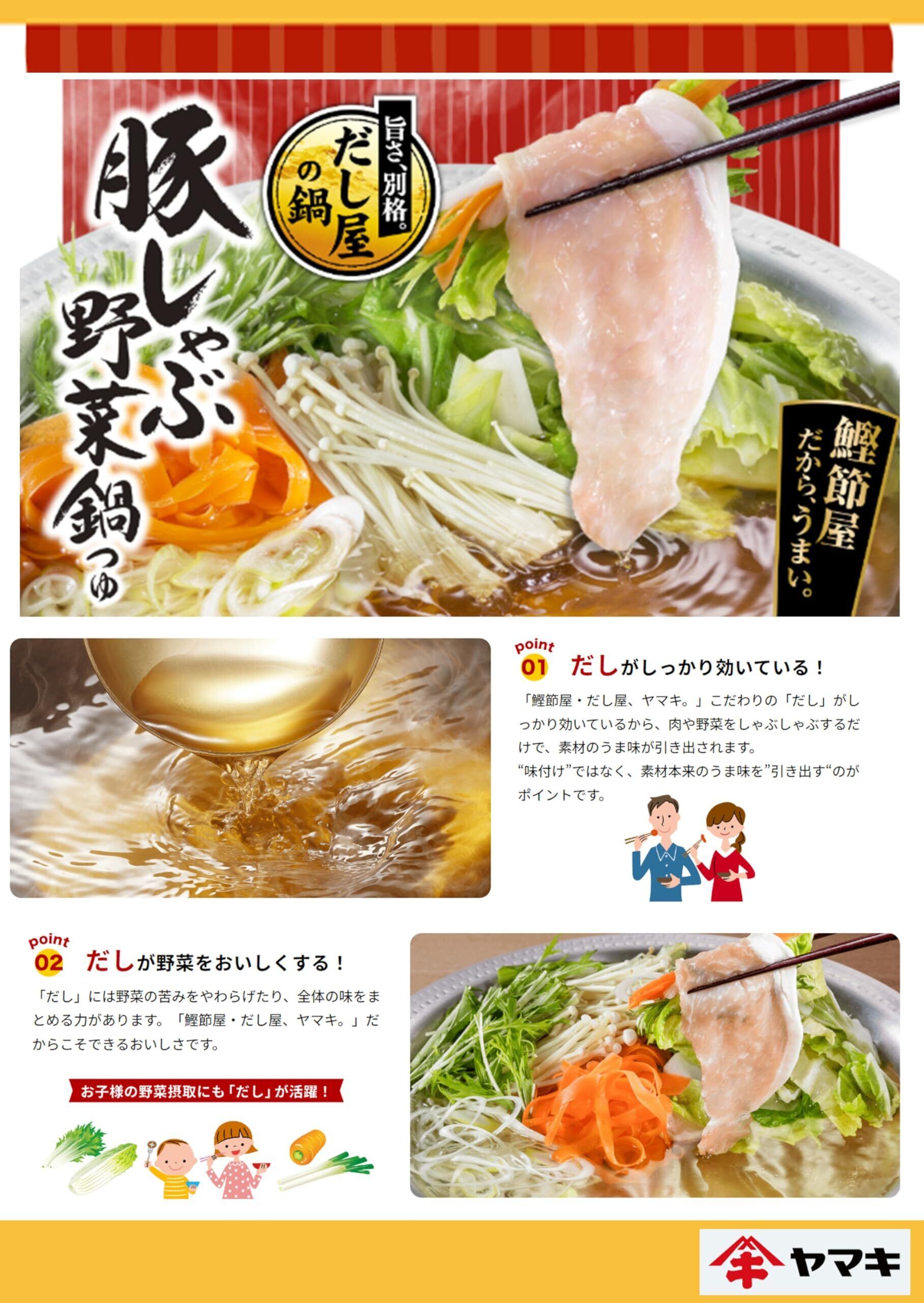 かつおだしスープでたっぷりの野菜と豚肉しゃぶしゃぶを美味しくご賞味頂く、新しい食べ方提案鍋つゆです。