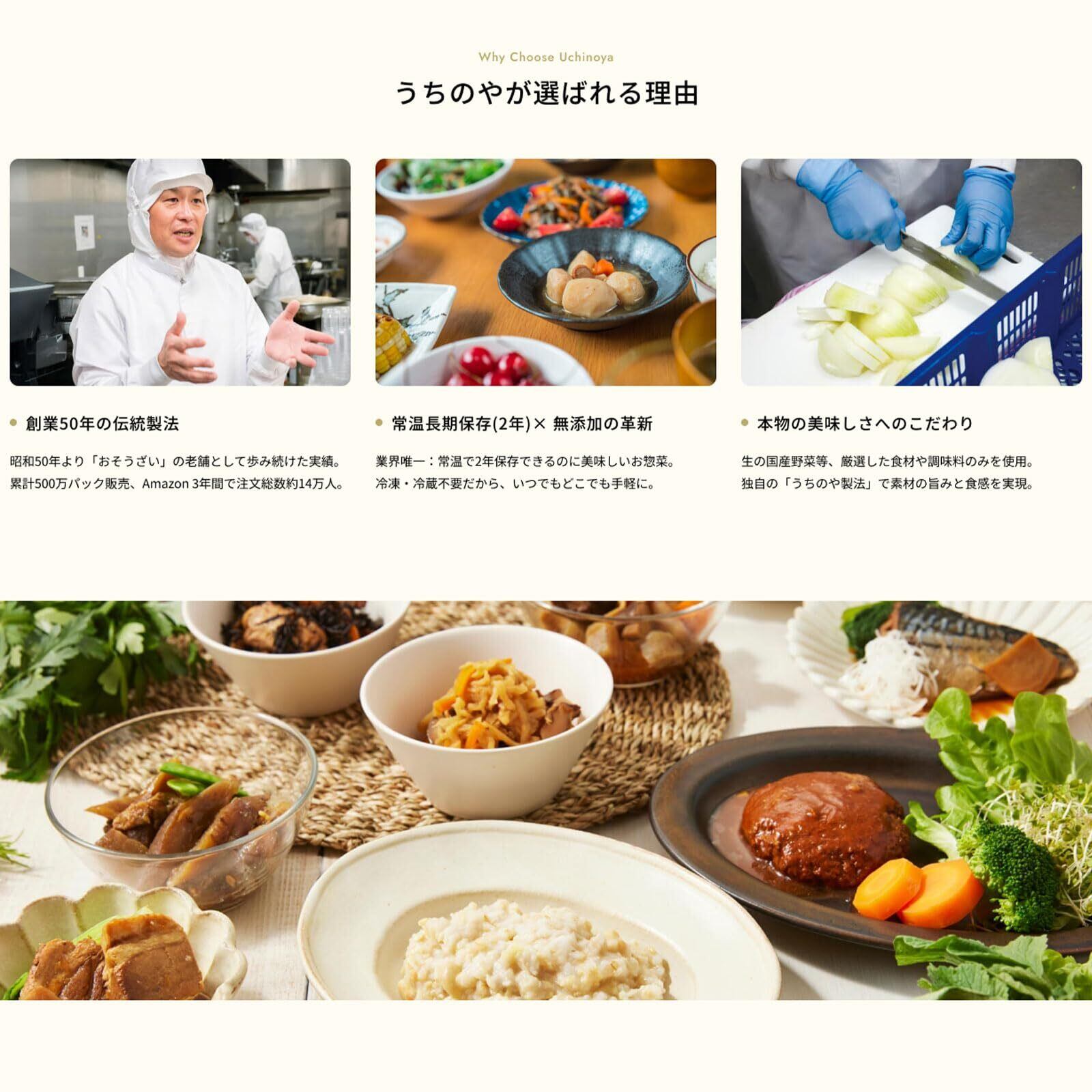 uchipacお惣菜全7品目をセットにしました。野菜は全て国産の野菜を使用しています。調理工程においてアミノ酸系調味料や、食品添加物は使用していません。「家族が毎日食べられる、素材の味を生かしたおいしいお惣菜」が商品のコンセプトです。