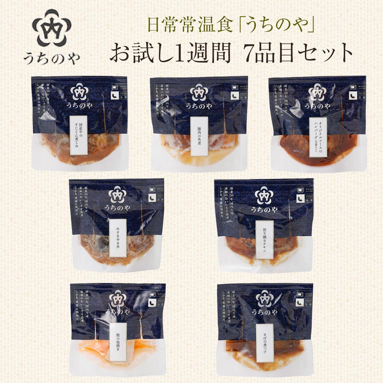 常温備食生活 うちのや お試し1週間 7品目セット 惣菜 お惣菜 レトルト食品 保存料 着色料 無添加 常温保存 非常食 備蓄食 角煮 照り焼きチキン 鮭 サバ ハンバーグ