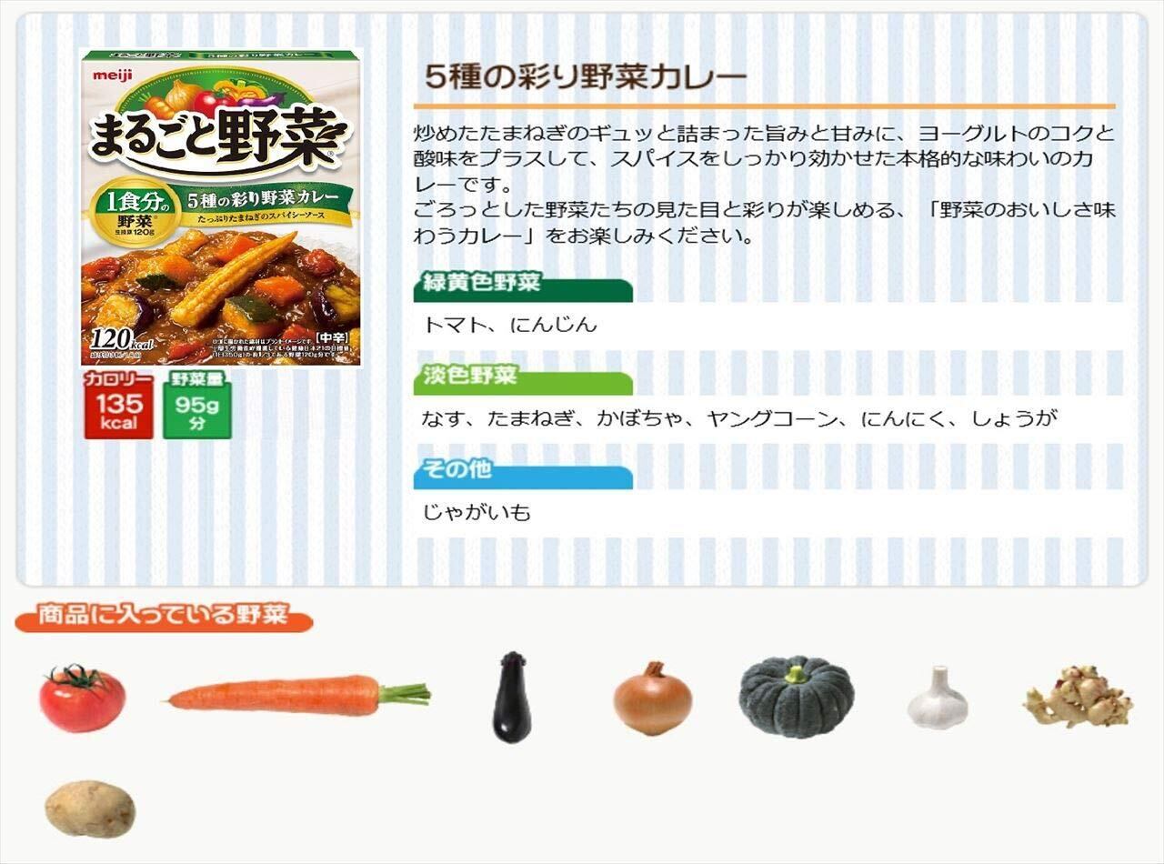 たっぷりの野菜の量と種類、独自の製法で引き出したおいしさ野菜をもっとおいしく、もっと手軽に摂れる商品を提供します。かぼちゃ、じゃがいも、ヤングコーン、なす、にんじんの5種のごろごろした野菜が入っており、1食分(120g)の野菜を摂ることができます。炒めたまねぎをたっぷり使用したソースをお楽しみください。