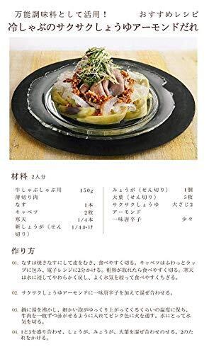 アレルギー物質 (28品目):小麦、アーモンド、ごま、大豆 原材料:なたね油(国内製造)、ローストアーモンド、フリーズドライしょうゆ(小麦、大豆を含む)、フライドオニオン(小麦を含む)、砂糖、食塩、ごま油、フライドガーリック、酵母エキス、ごま、しょうゆ、魚醤パウダー、こしょう/加工でん粉、酸化防止剤(ビタミンE)