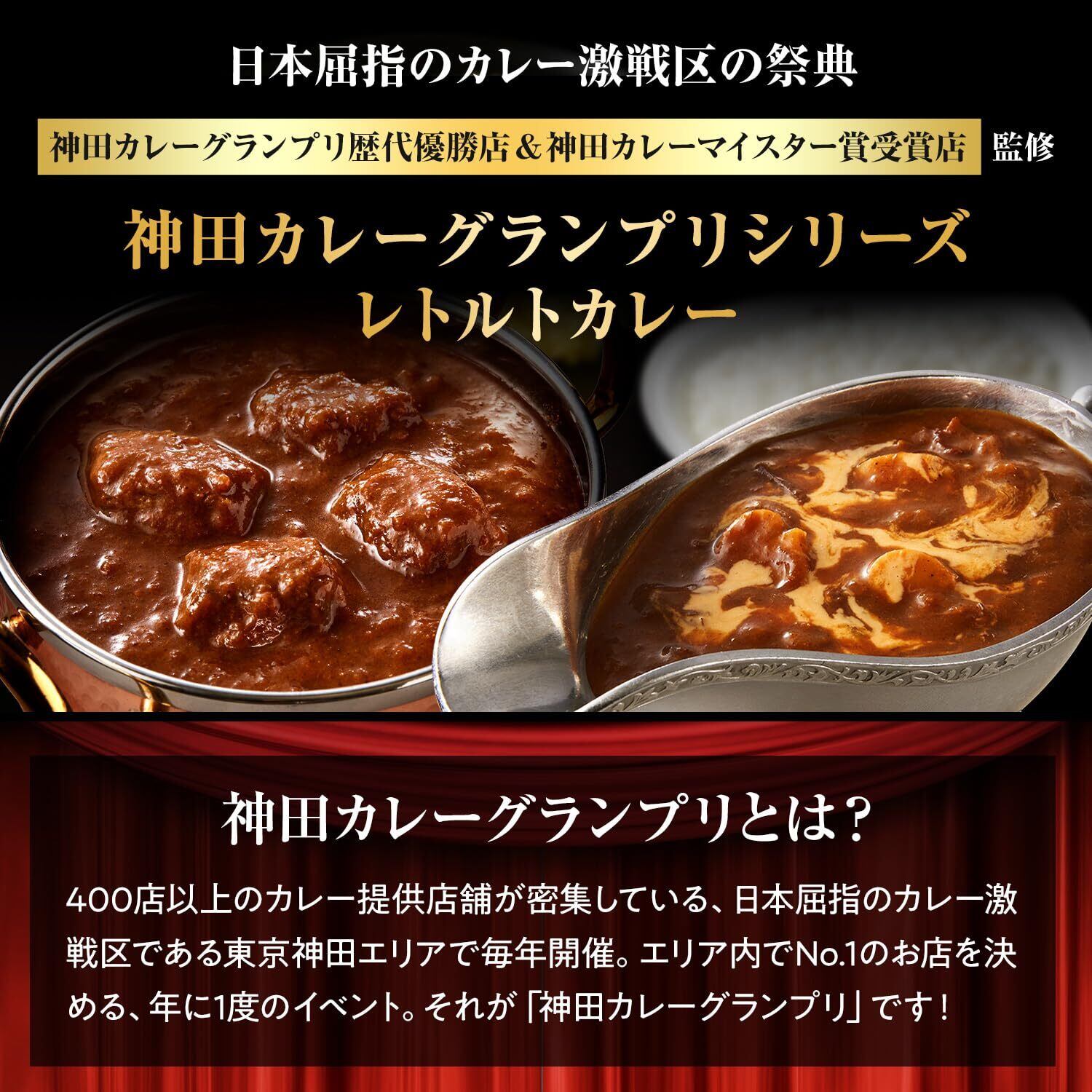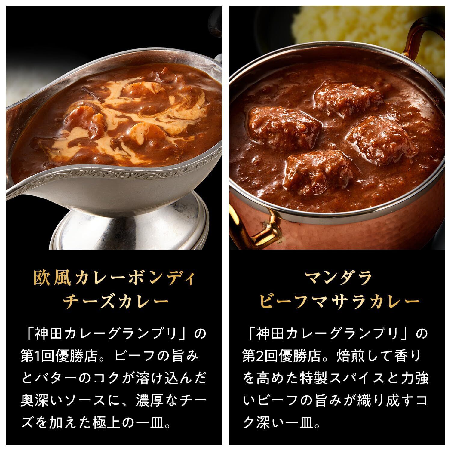 日本屈指のカレー激戦区 東京・神田で年に一度開催される「神田カレーグランプリ」の歴代優勝店監修によるレトルトカレーシリーズです。【欧風カレーボンディ チーズカレー】第1回優勝店。ビーフの旨みとバターのコクが溶け込んだ奥深いソースに、濃厚なチーズを加えた極上の一皿をお楽しみください。【マンダラ ビーフマサラカレー】第2回優勝店。焙煎して香りを高めた特製スパイスと力強いビーフの旨みが織り成すコク深い味わいをお楽しみください。