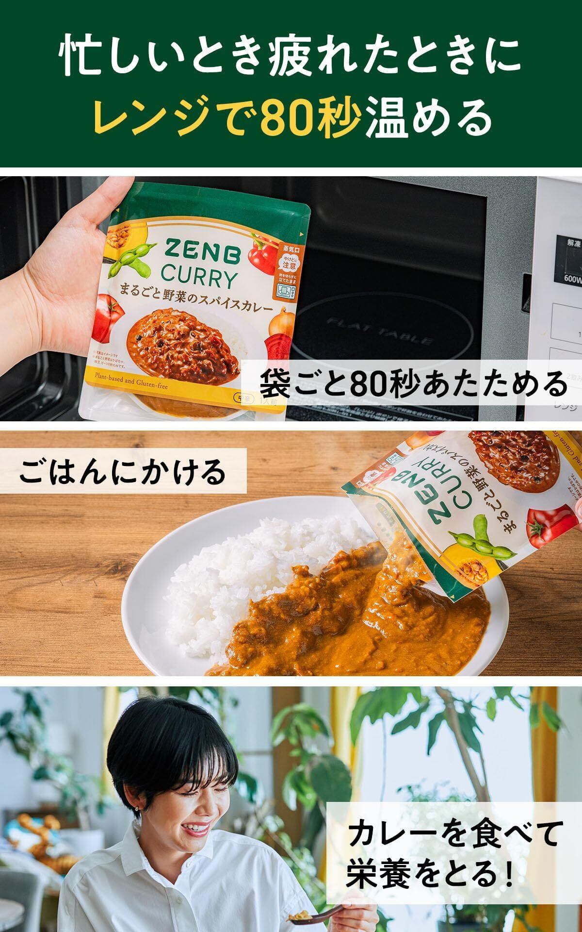 【野菜たっぷり スパイスカレー】累計販売数2000万食*1を突破した豆100%の麺、「ZENB ヌードル ( ゼンブヌードル )」が話題のZENBシリーズから、グルテンフリーのスパイスカレーがリニューアル。野菜たっぷり150g※2 1日に必要とされる野菜量の1/3がしっかり摂れます※3 。6種類の野菜の栄養をぎゅっと凝縮し、レンジ調理OKのレトルトなのに、不足しがちな野菜がとれる一皿に。普段食べられていない種・わたまでまるごとの「かぼちゃ」、さやまでまるごとの「枝豆」、皮までまるごとの「ビーツ」をぎゅっと凝縮した3種類のまるごと野菜粉をベースに、厳選したこだわりのスパイスを効かせた、カラダにも地球にもやさしいスパイスカレーです。*1:2025年4月30日時点 ※2:生換算 ※3:厚生労働省が推進する健康日本21における1日あたりの野菜目標摂取量350gを1日分として計算