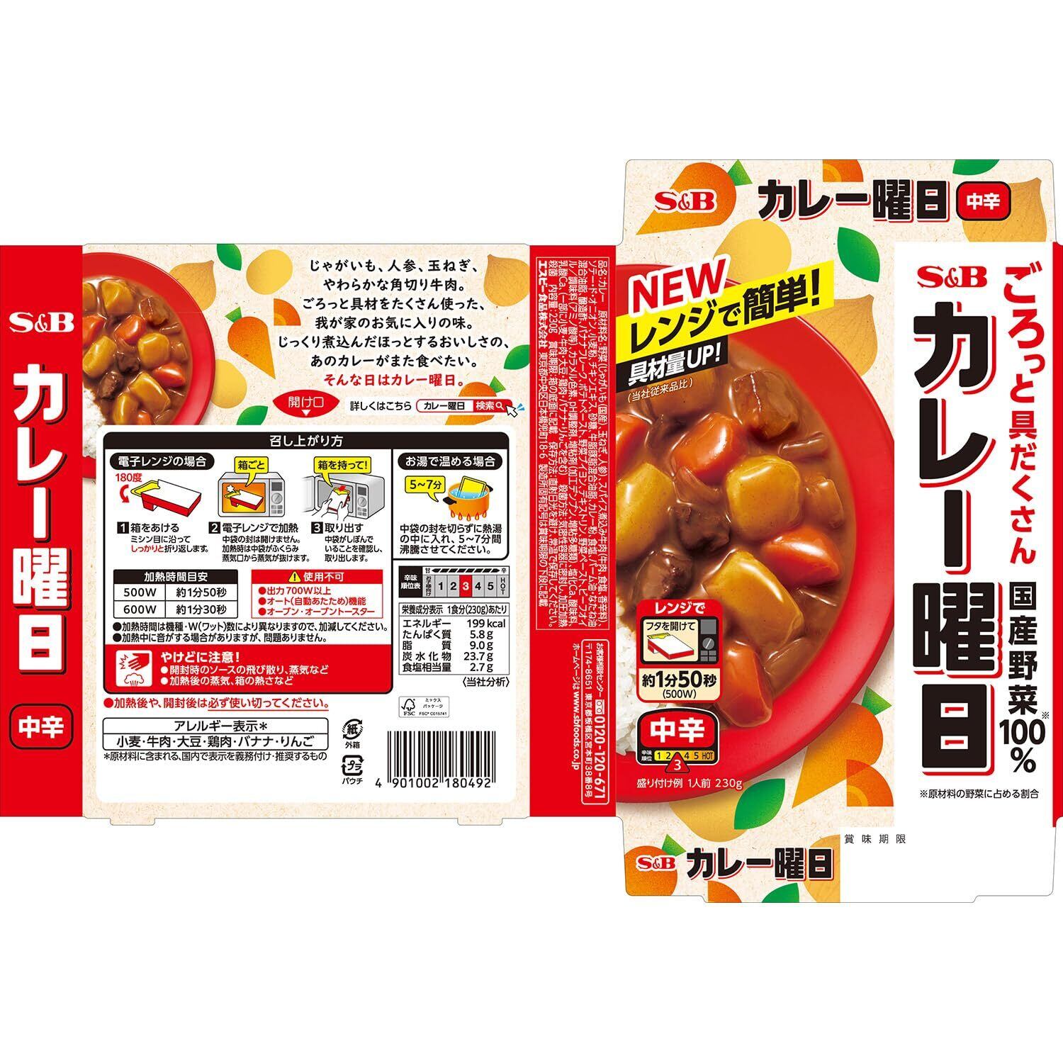 野菜(じゃがいも(国産)、玉ねぎ、人参)、スパイス煮込み牛肉(牛肉、食塩、香辛料)、ソテー・ド・オニオン、小麦粉、チキンエキス、砂糖、牛脂豚脂混合油脂、カレー粉、食塩、パーム油・なたね油混合油脂、醸造酢、バナナフレーク、ポテトペースト、野菜ブイヨン、デキストリン、野菜ペースト、ビーフオイル/調味料(アミノ酸等)、カラメル色素、pH調整剤、増粘剤(加工デンプン、増粘多糖類)、塩化Ca、酸味料、乳酸Ca、(一部に小麦・牛肉・大豆・鶏肉・バナナ・りんごを含む)