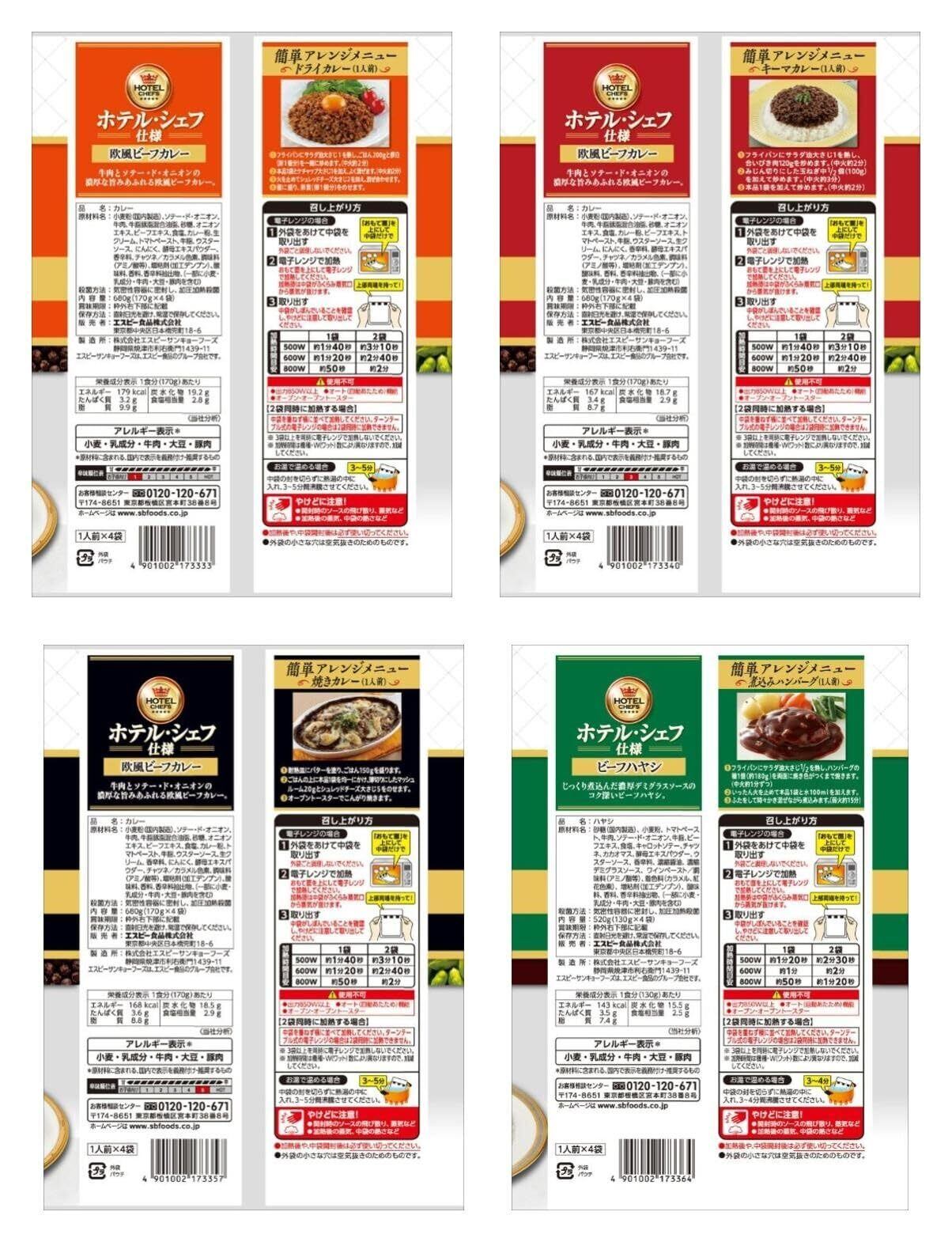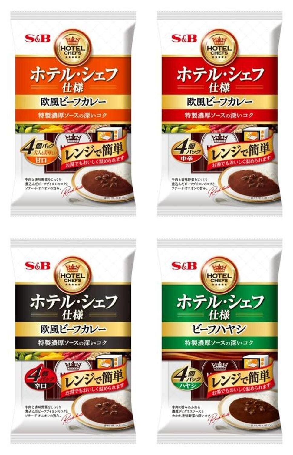 甘口:お得な4個パック仕様の本格欧風カレーです。牛肉と香味野菜をじっくり煮込んだビーフブイヨンと、ソテー・ド・オニオンの旨み。フルーツチャツネを加え、芳醇で豊かな味わいの甘口です。電子レンジ調理対応。 中辛・辛口:お得な4個パック仕様の本格欧風カレーです。牛肉と香味野菜をじっくり煮込んだビーフブイヨンと、じっくり炒めたソテー・ド・オニオンの旨み。生クリームで仕上げたコク深い味わいです。電子レンジ調理対応。 ハヤシ:お得な4個パック仕様の本格ビーフハヤシです。ソテー度の高い炒め玉ねぎのコクを増やし、牛肉の旨みあふれる濃厚なデミグラスソースの深い味わいを表現。電子レンジ調理対応。