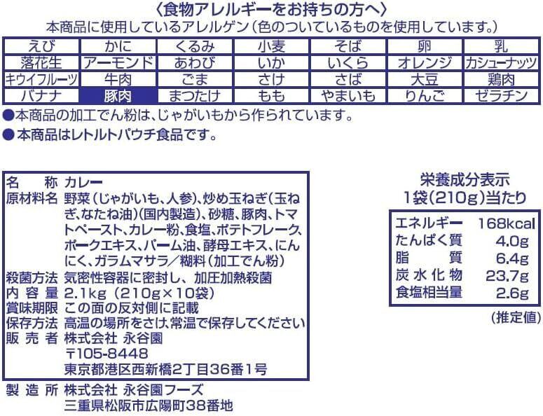 原材料:野菜(じゃがいも、人参)、炒め玉ねぎ(玉ねぎ、なたね油)(国内製造)、砂糖、豚肉、トマトペースト、カレー粉、食塩、ポテトフレーク、ポークエキス、パーム油、酵母エキス、にんにく、ガラムマサラ/糊料(加工でん粉)