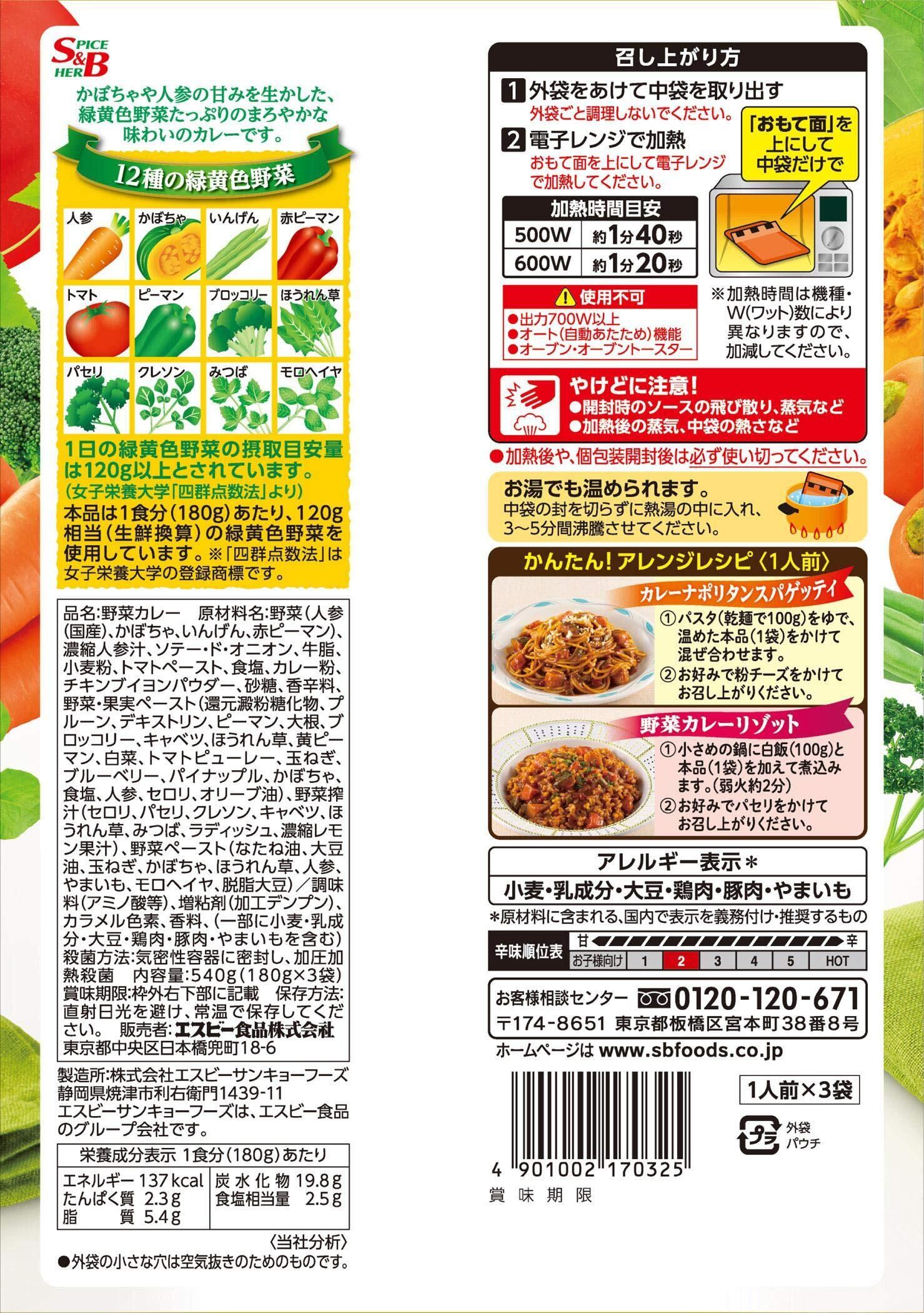 S&B エスビー食品 1日分の緑黄色野菜のカレー 3個パック 中辛 540g ×8袋