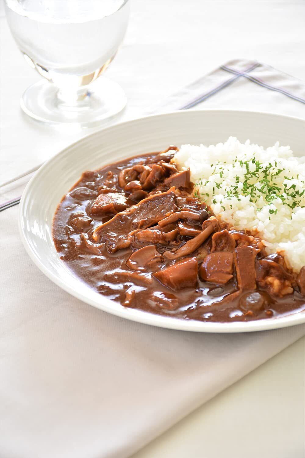 横浜みなとみらいにそびえる、日本有数の超高層ビル“ランドマークタワー”に位置する、横浜ロイヤルパークホテル監修&おすすめの1品です。横浜ロイヤルパークホテルは、日本一高層の客室を有するホテルとしても知られています。コクのあるソースにトマトの酸味をきかせ、ビーフに野菜・きのこと具沢山に仕上げた味わい深いハヤシです。コクと旨味、ほのかな酸味のバランスは絶妙で、大人の方はもちろん、お子様にも味わっていただきたい品です。