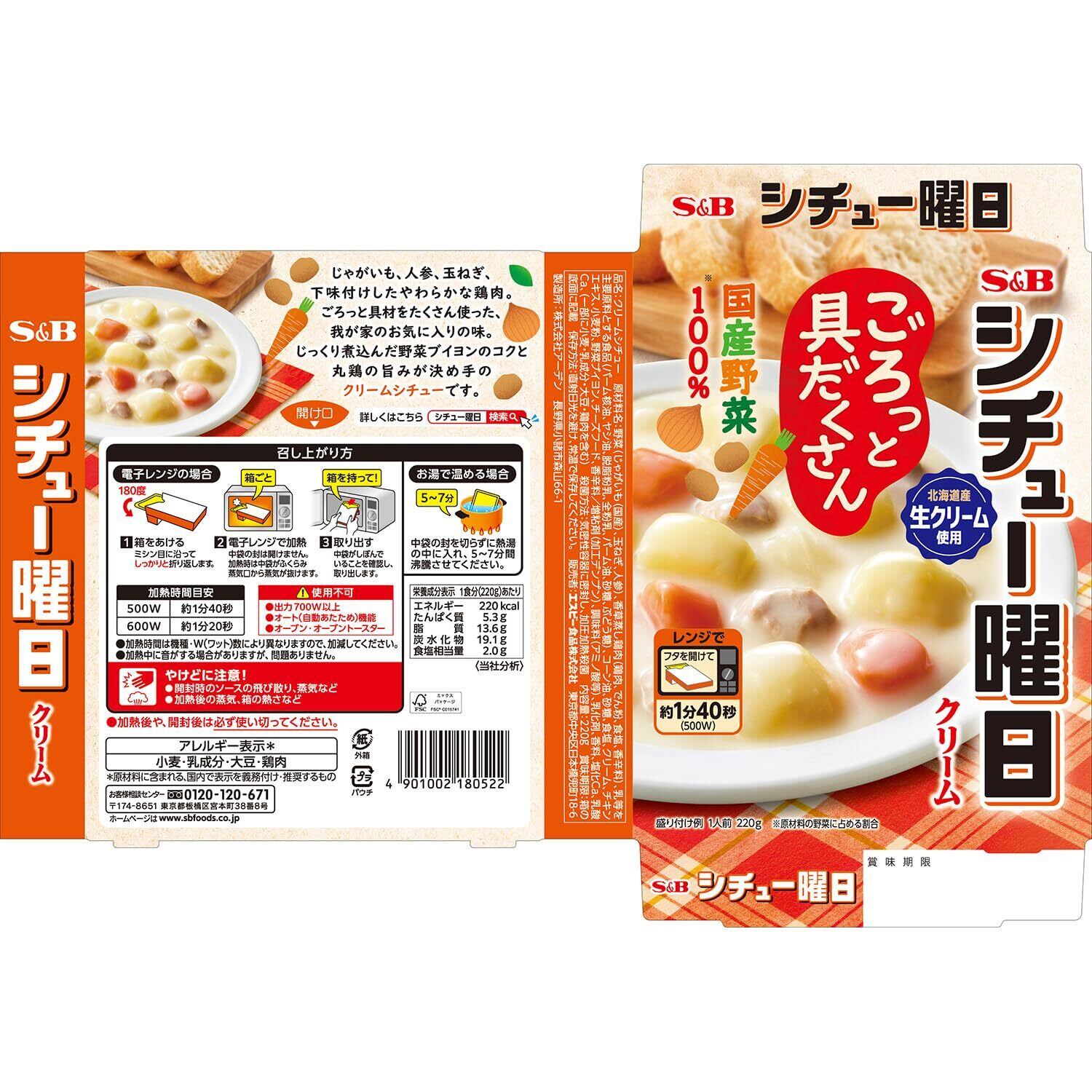 野菜(じゃがいも(国産)、玉ねぎ、人参)、香草蒸し鶏肉(鶏肉、でん粉、食塩、香辛料)、乳等を主要原料とする食品(パーム核油、ヤシ油、脱脂粉乳、全粉乳、パーム油、砂糖、ぶどう糖)、コーン油、砂糖、食塩、クリーム、チキンエキス、小麦粉、野菜ブイヨン、チーズフード、香辛料/増粘剤(加工デンプン)、調味料(アミノ酸等)、乳化剤、香料、塩化Ca、乳酸Ca、(一部に小麦・乳成分・大豆・鶏肉を含む)殺菌方法:気密性容器に密封し、加圧加熱殺菌