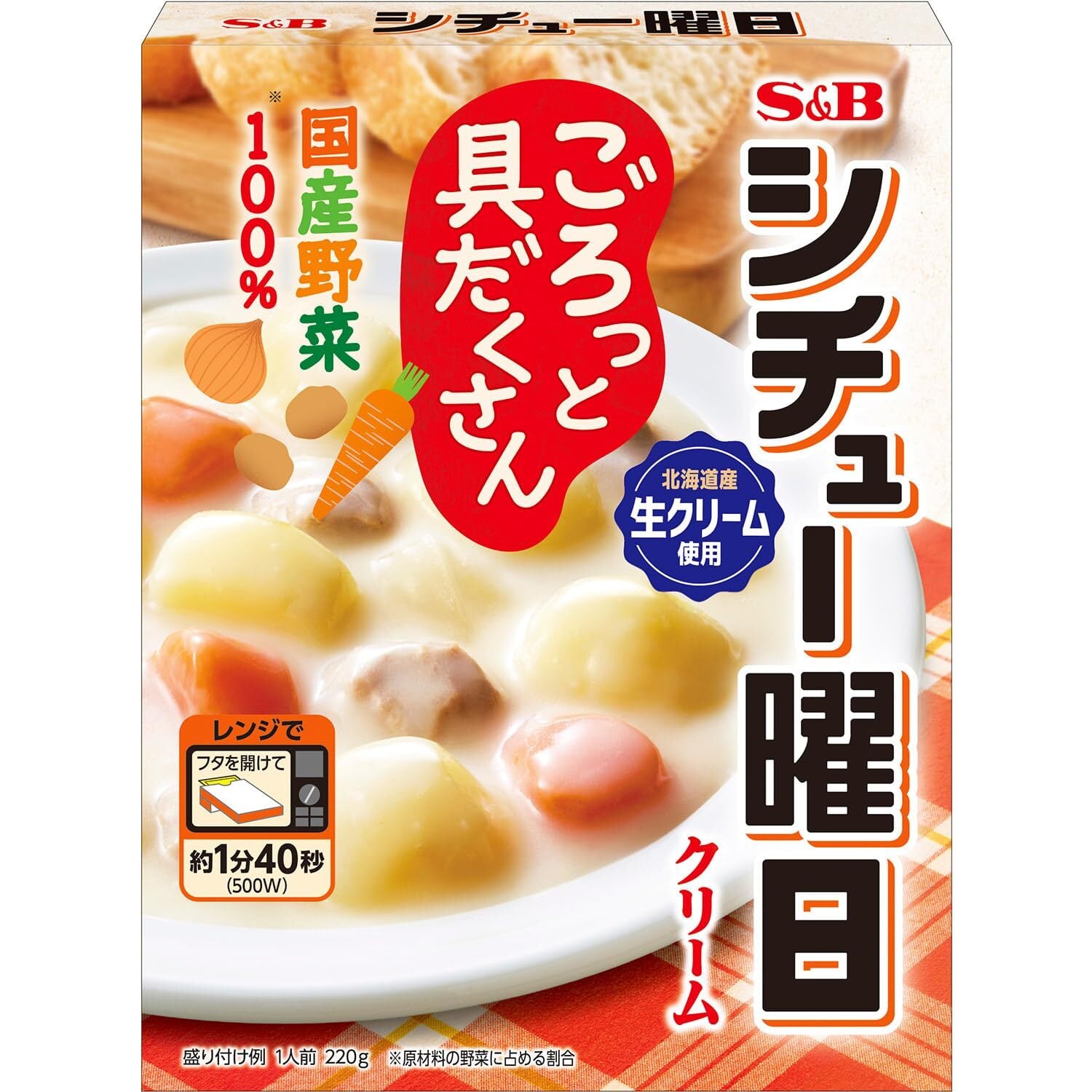 たっぷり入った国産野菜100%のごろごろ具材と、下味付けしたやわらかな鶏肉。北海道産生クリームを使用し、じっくり煮込んだ野菜ブイヨンと丸鶏のコクを効かせた家庭的な味わいのクリームシチューです。