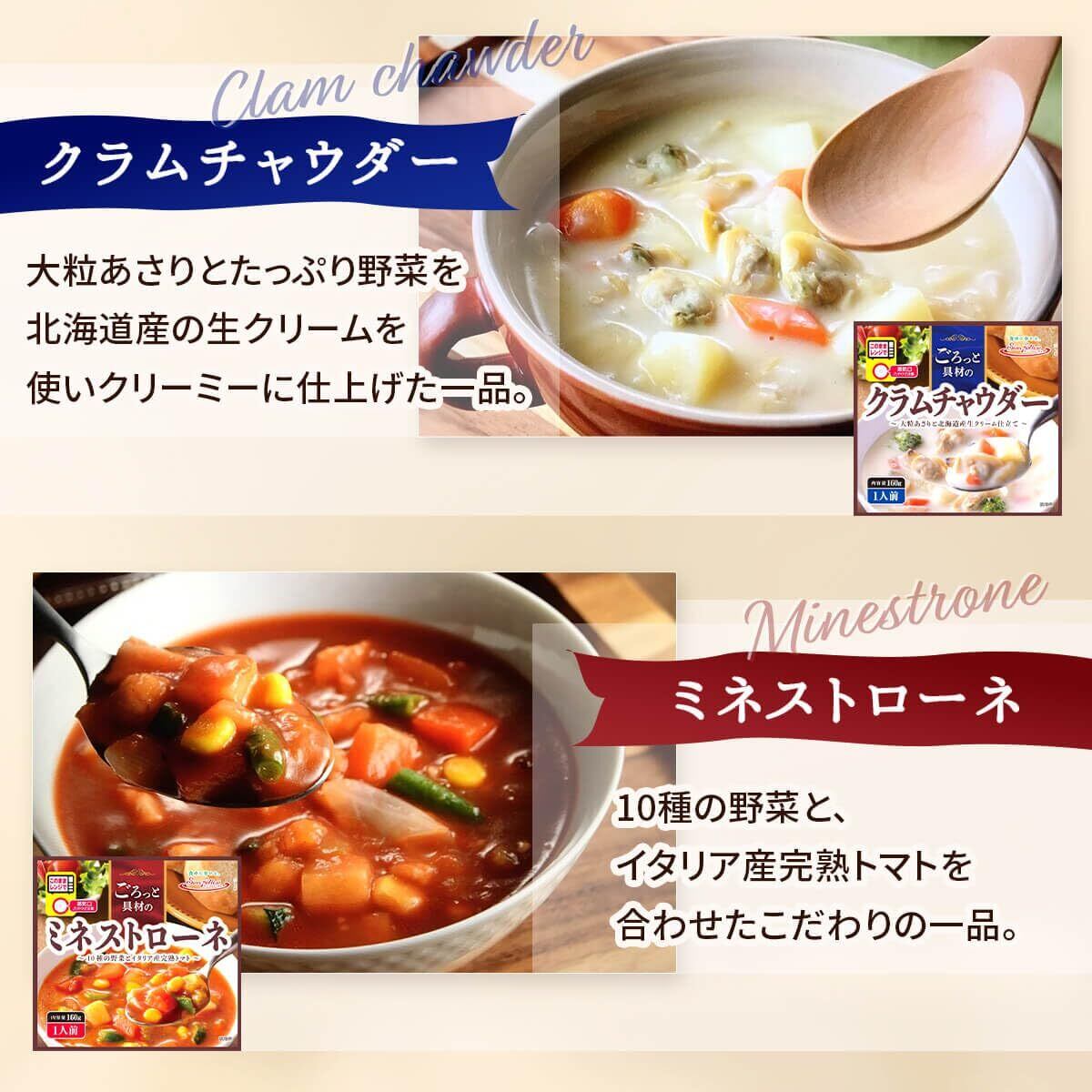 赤ワイン本格煮込み ビーフシチュー 野菜 たっぷり クリームシチュー 大粒 あさり を使用した クラムチャウダー イタリア産 完熟トマト の ミネストローネ の4種類。ええもん広場 オリジナル 国産 乾燥野菜 付き