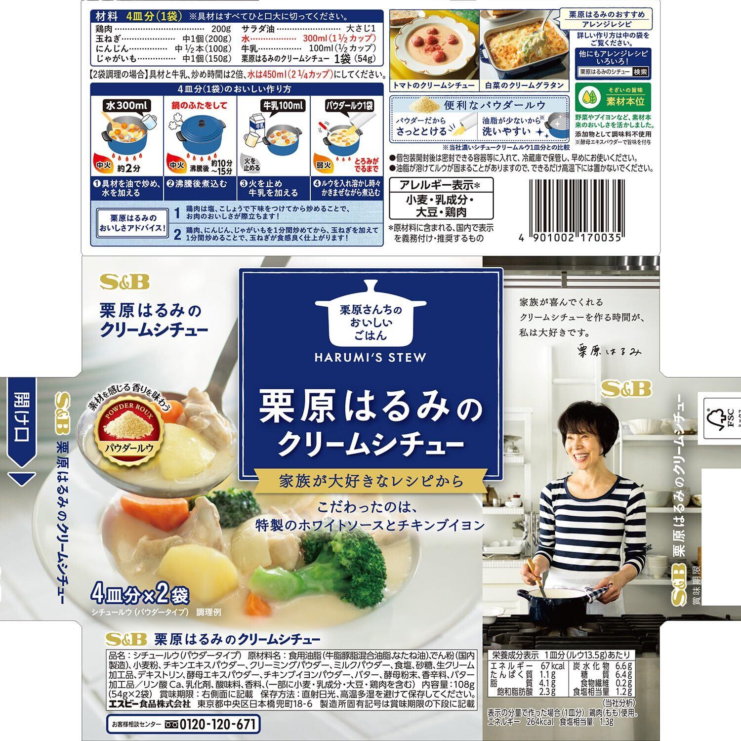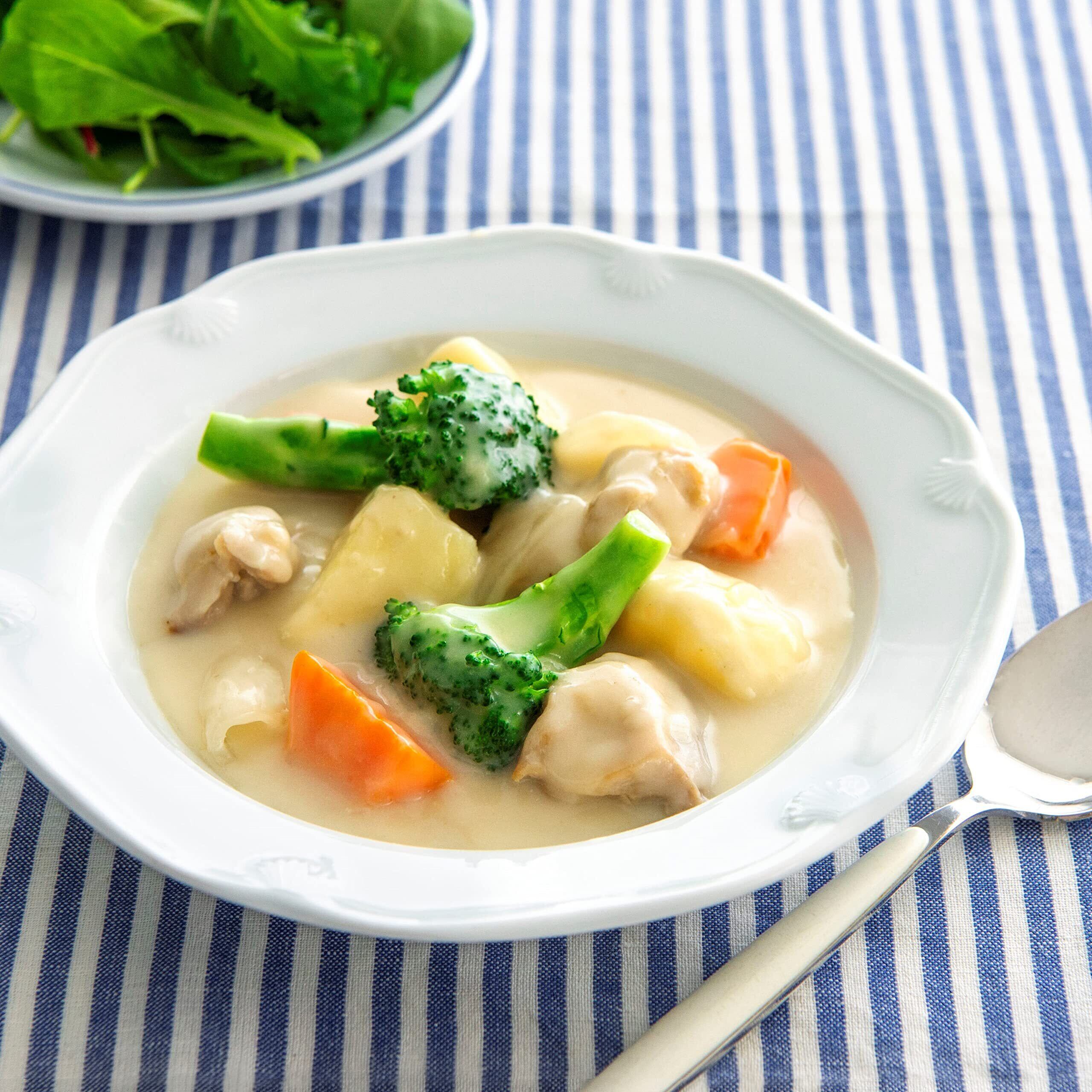 栗原はるみさん監修のクリームシチューです。特製のチキンブイヨンと丁寧に仕立てたホワイトソースを合わせることで、素材のおいしさがたっぷり味わえます。(化学調味料無添加)