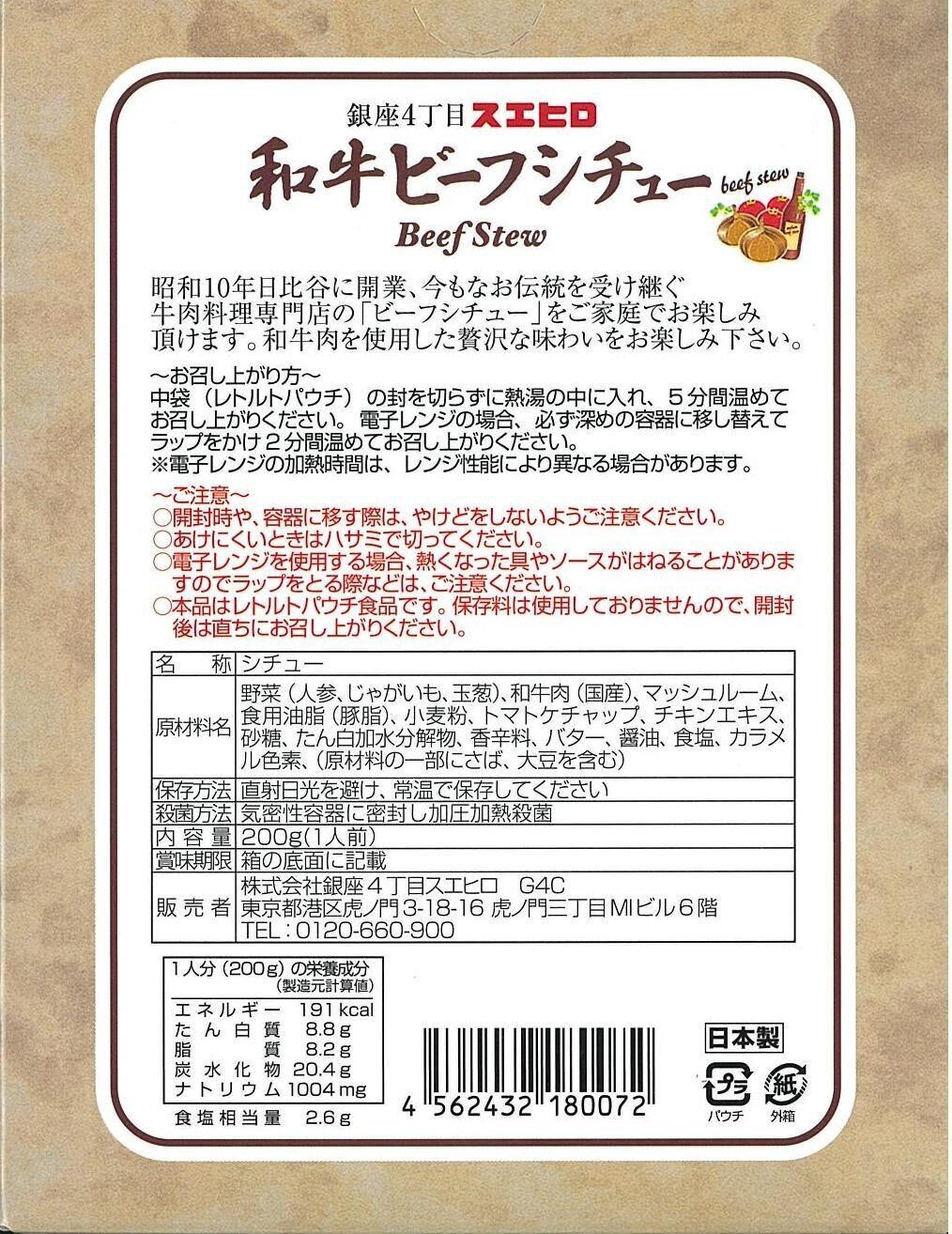 銀座4丁目スエヒロ ビーフシチュー レトルト 黒毛和牛使用 200g×3個