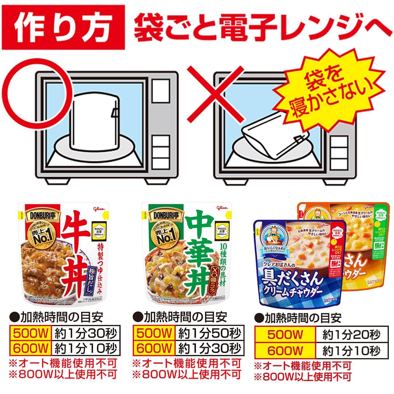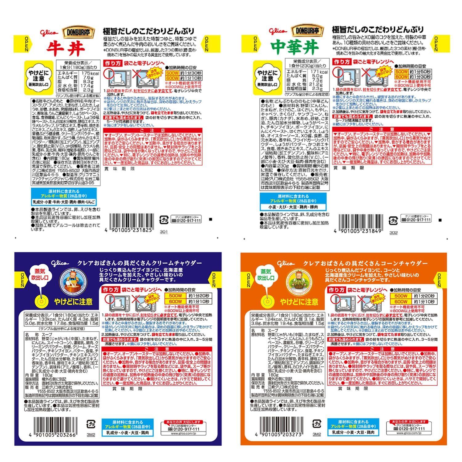 ・グリコの【DONBURI亭】と【クレアおばさん】から袋ごとレンジでそのまま調理可能なパウチタイプのレトルト4種類を詰め合わせたアソートセットです。