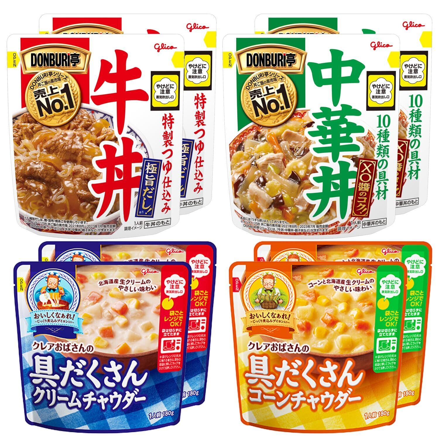 DONBURI亭 レトルト詰め合わせ 4種8食セット(DONBURI亭中華丼×2食/牛丼×2食/クレアおばさんの具だくさんクリームチャウダー×2食/コーンチャウダー×2食) 江崎グリコ 【食べ比べ/常温保存/レンジで温め簡単/どんぶりのもと/スープ】