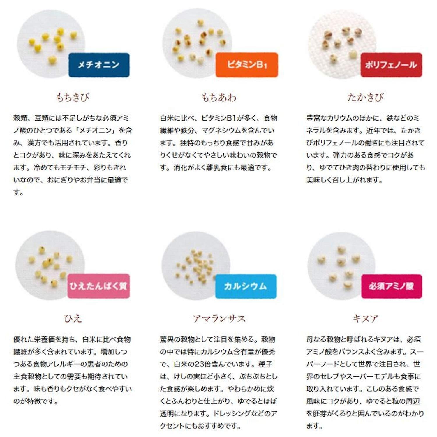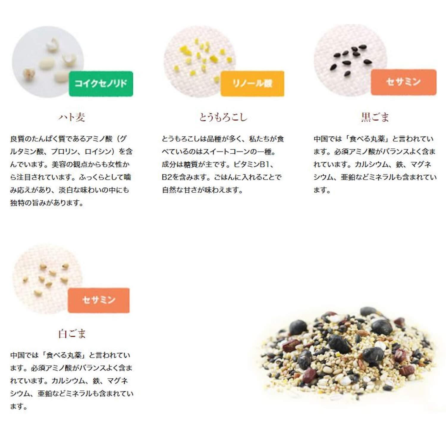 うるち米・もちあわ・黒米・黒豆(大豆)・アマランサス・発芽玄米・キヌア・たかきび・小豆・黒ごま・白ごま・もちきび・大麦・赤米・ひえ・はと麦・とうもろこし