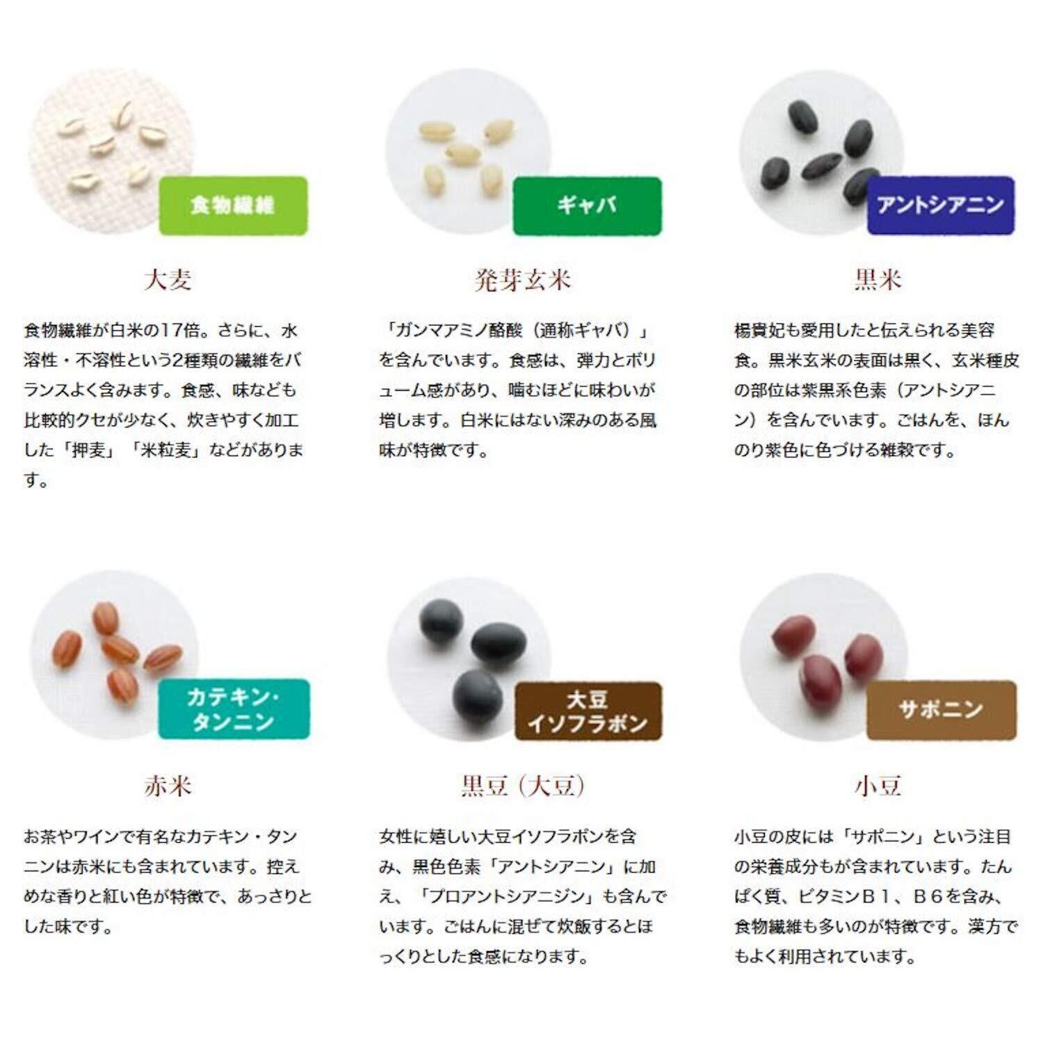 原材料:うるち米・もちあわ・黒米・黒豆(大豆)・アマランサス・発芽玄米・キヌア・たかきび・小豆・黒ごま・白ごま・もちきび・大麦・赤米・ひえ・はと麦・とうもろこし