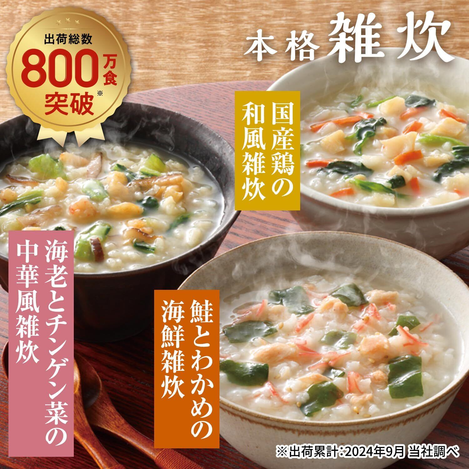 国産コシヒカリを使用し、味わい深いスープで炊き上げた雑炊。海鮮だしとホタテの旨みを閉じ込めた「鮭とわかめの海鮮雑炊」、やさしい和風だしの「国産鶏の和風雑炊」、ごま油香る風味豊かな「海老とチンゲン菜の中華風雑炊」の3種セットです。