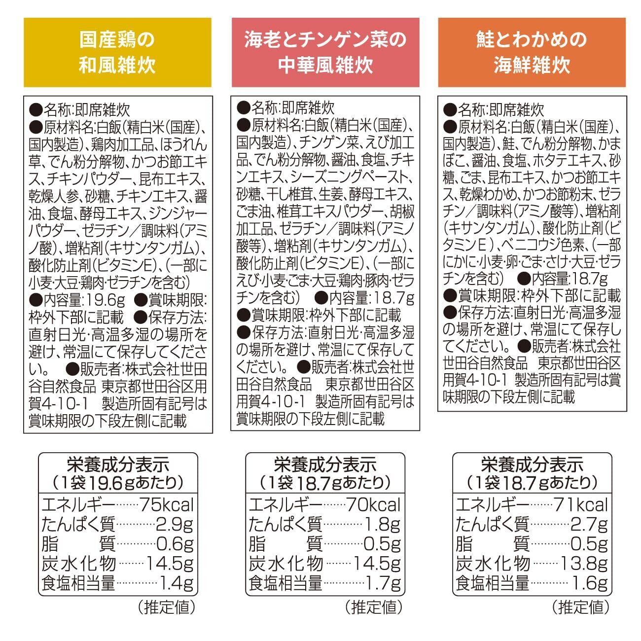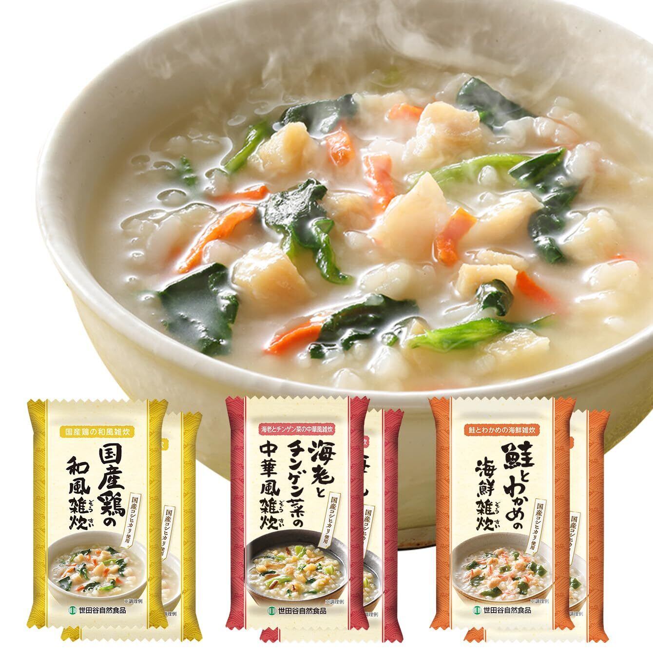 世田谷自然食品 雑炊 3種の6食セット (各2食 鮭とわかめの海鮮雑炊、国産鶏の和風雑炊、海老とチンゲン菜の中華風雑炊) 御歳暮 フリーズドライ 災害用 保存食 インスタント雑炊 即席 お粥 1食61kcal以下 / 置き換え/カロリー対策