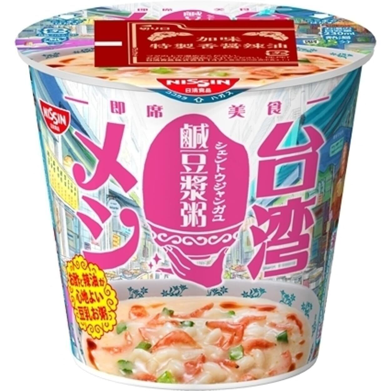 「日清台湾メシ 鹹豆漿粥」は、台湾の定番朝食 "鹹豆漿" をカップメシ流にアレンジしたおかゆ商品です。豆乳にお酢の酸味をきかせた、コクのあるやさしい味わいが特長です。仕上げに「加味特製香醤辣油 (カミトクセイコウジャンラーユ)」を加えれば、辣油の香ばしい風味が広がります。
