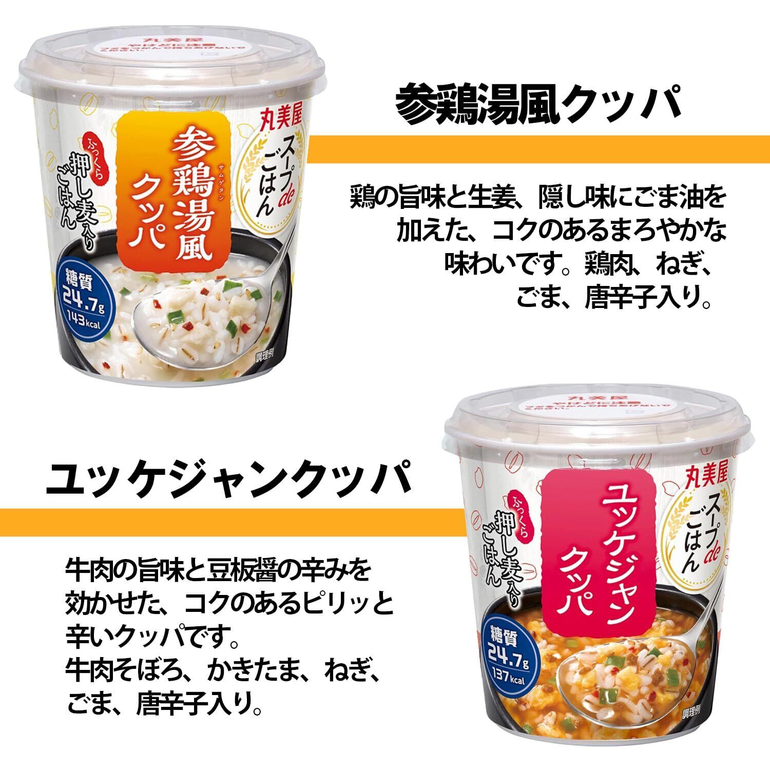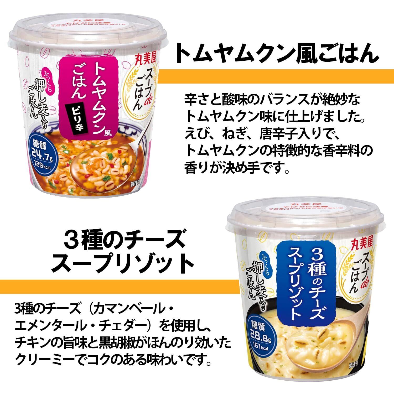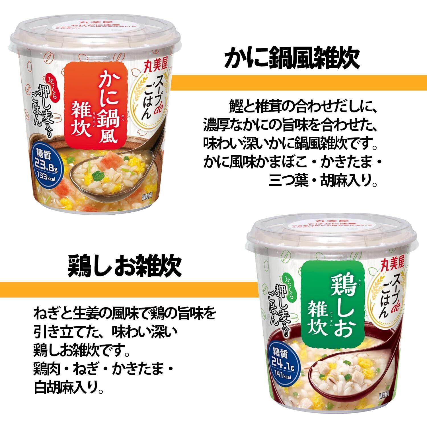 【セット内容】スープdeごはん かに鍋風雑炊 69g ×2個、スープdeごはん 鶏しお雑炊 70.3g ×2個、ごま豆乳雑炊72.1g ×2個、完熟トマトのスープリゾット 73.3g ×2個、スープdeごはん 参鶏湯風クッパ 70.2g ×1個、スープdeごはん ユッケジャンクッパ 69.8g ×1個、スープdeごはん トムヤムクン風ごはん 69.7g ×1個、スープdeごはん 3種のチーズスープリゾット 75g ×1個