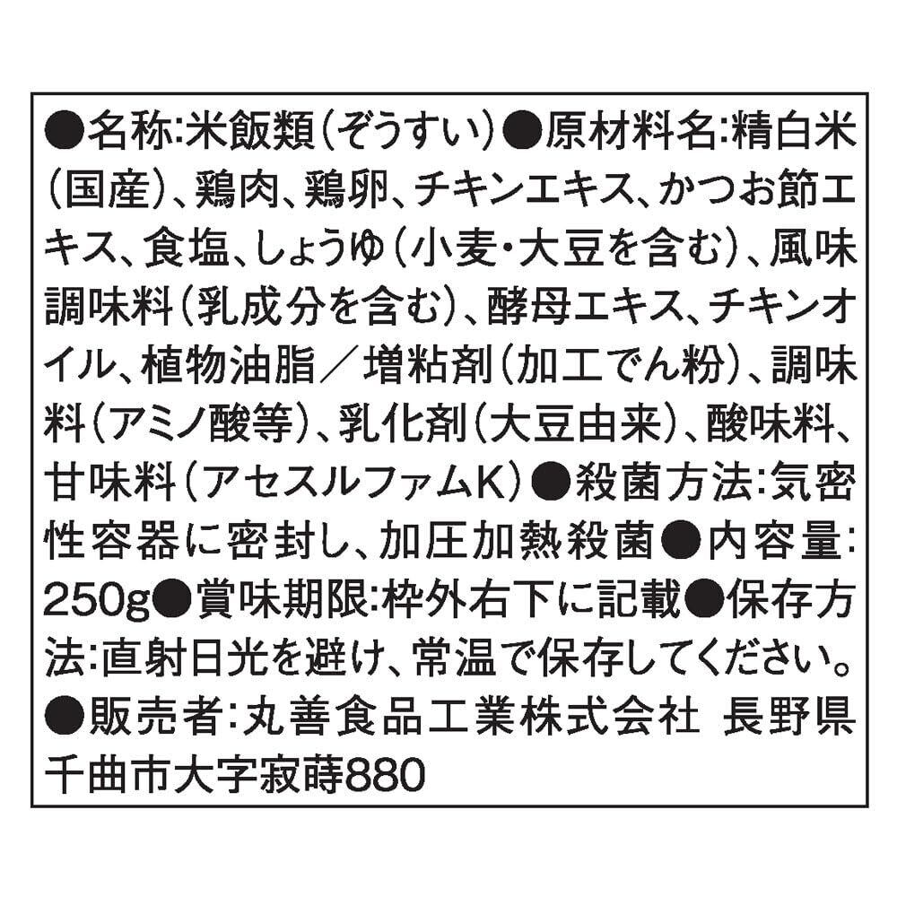 精白米(国産)、鶏肉、鶏卵、チキンエキス、かつお節エキス、食塩、しょうゆ(小麦・大豆を含む)、風味調味料(乳成分を含む)、酵母エキス、チキンオイル、植物油脂/増粘剤(加工でん粉)、調味料(アミノ酸等)、乳化剤(大豆由来)、酸味料、甘味料(アセスルファムK)