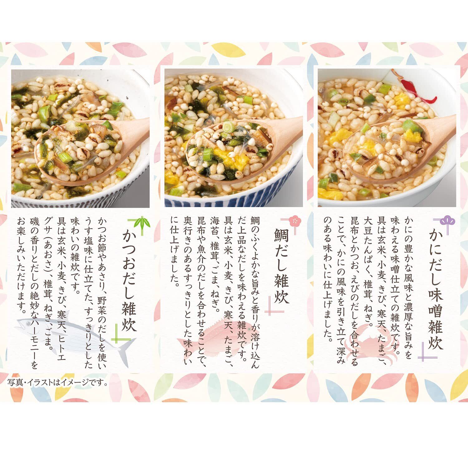 【かにだし味噌雑炊】乾燥玄米(国内製造)、粉末みそ、鶏卵加工品、酵母エキス、寒天、かに殻粉末、乾燥小麦、粒状大豆たんぱく、えび調味料粉末、乾燥きび、乾燥しいたけ、昆布粉末、乾燥ねぎ、発酵調味料粉末、食塩、砂糖、粉末ごま油、かつお節粉末/トレハロース、加工でん粉、カロテノイド色素、(一部に卵・小麦・えび・かに・ごま・大豆を含む)【鶏ごぼう味噌雑炊】乾燥玄米(国内製造)、粉末みそ、チキンエキスパウダー、寒天、乾燥小麦、乾燥ごぼう、ごぼうエキス粉末、乾燥にんじん、酵母エキス、砂糖、粒状大豆たんぱく、鶏卵加工品、乾燥きび、野菜エキス粉末、乾燥ねぎ、白菜エキス粉末、野菜粉末、食塩、しいたけエキス粉末、粉末ごま油/加工でん粉、トレハロース、カロテノイド色素、(一部に卵・小麦・ごま・大豆・鶏肉を含む)【鶏白湯雑炊】乾燥玄米(国内製造)、チキンエキスパウダー、寒天、粒状大豆たんぱく、鶏卵加工品、粉末油脂、乾燥小麦、酵母エキス、乾燥ねぎ、乾燥きび、たまねぎ粉末、ポークエキスパウダー、食塩、白菜エキス粉末、香辛料、ごま、粉末ごま油/加工でん粉、トレハロース、着色料(カロテノイド、カラメル)、(一部に卵・乳成分・小麦・ごま・大豆・鶏肉・豚肉を含む)【鯛だし雑炊】乾燥玄米(国内製造)、たいエキス粉末、酵母エキス、寒天、鶏卵加工品、魚介エキス粉末、乾燥小麦、粉末しょうゆ、乾燥きび、のり、乾燥しいたけ、デキストリン、昆布粉末、食塩、あさりエキス粉末、煮干し粉末、ごま、乾燥ねぎ、植物油脂/トレハロース、加工でん粉、カロテノイド色素、(一部に卵・小麦・ごま・大豆を含む)【かつおだし雑炊】乾燥玄米(国内製造)、寒天、乾燥小麦、食塩、酵母エキス、乾燥ねぎ、乾燥ヒトエグサ、あさりエキス粉末、かつお節粉末、乾燥きび、乾燥しいたけ、砂糖、たまねぎ粉末、デキストリン、魚介エキス粉末、白菜エキス粉末、ごま、ガーリックパウダー/加工でん粉、(一部に小麦・ごまを含む)