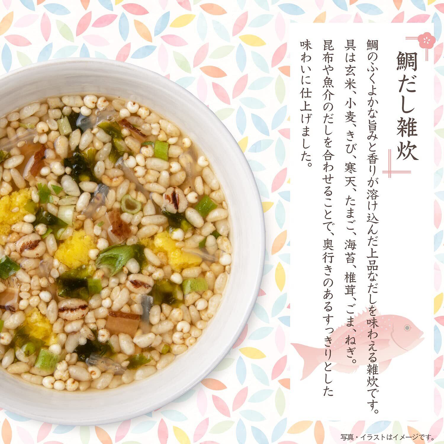 ■鯛だし雑炊:鯛のふくよかな旨みと香りが溶け込んだ上品なだしを味わえる雑炊です。具は玄米、小麦、きび、寒天、たまご、海苔、椎茸、ごま、ねぎ。昆布や魚介のだしを合わせることで、奥行きのあるすっきりとした味わいに仕上げています。