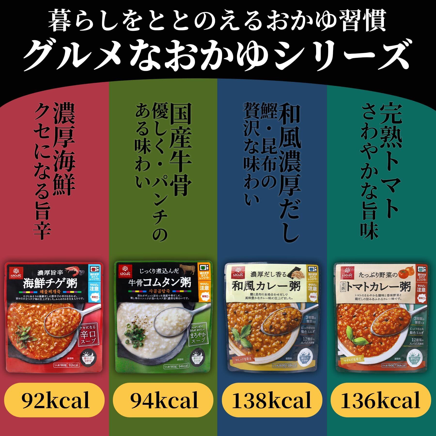 はくばく「グルメなおかゆ」シリーズの4種アソートです。濃厚旨辛海鮮チゲ粥、じっくり煮込んだ牛骨コムタン粥、濃厚だし香る和風カレー粥、たっぷり野菜の完熟トマトカレー粥が1袋ずつ入っています。袋のまま電子レンジで温めて食べられるので、忙しいときの食事にぴったり!温めずにそのままでも美味しく召し上がれますので、常備食としてもご活用ください。